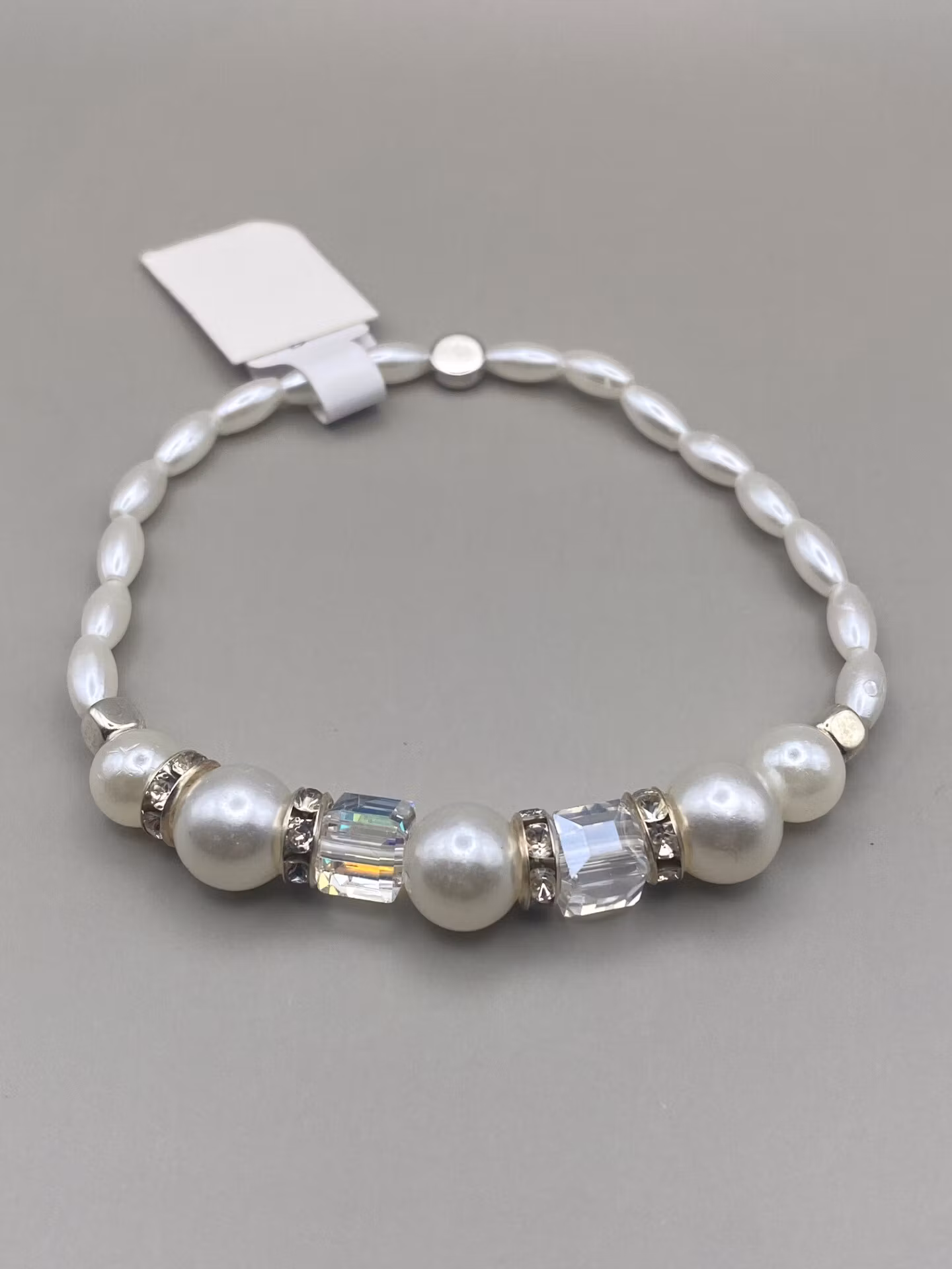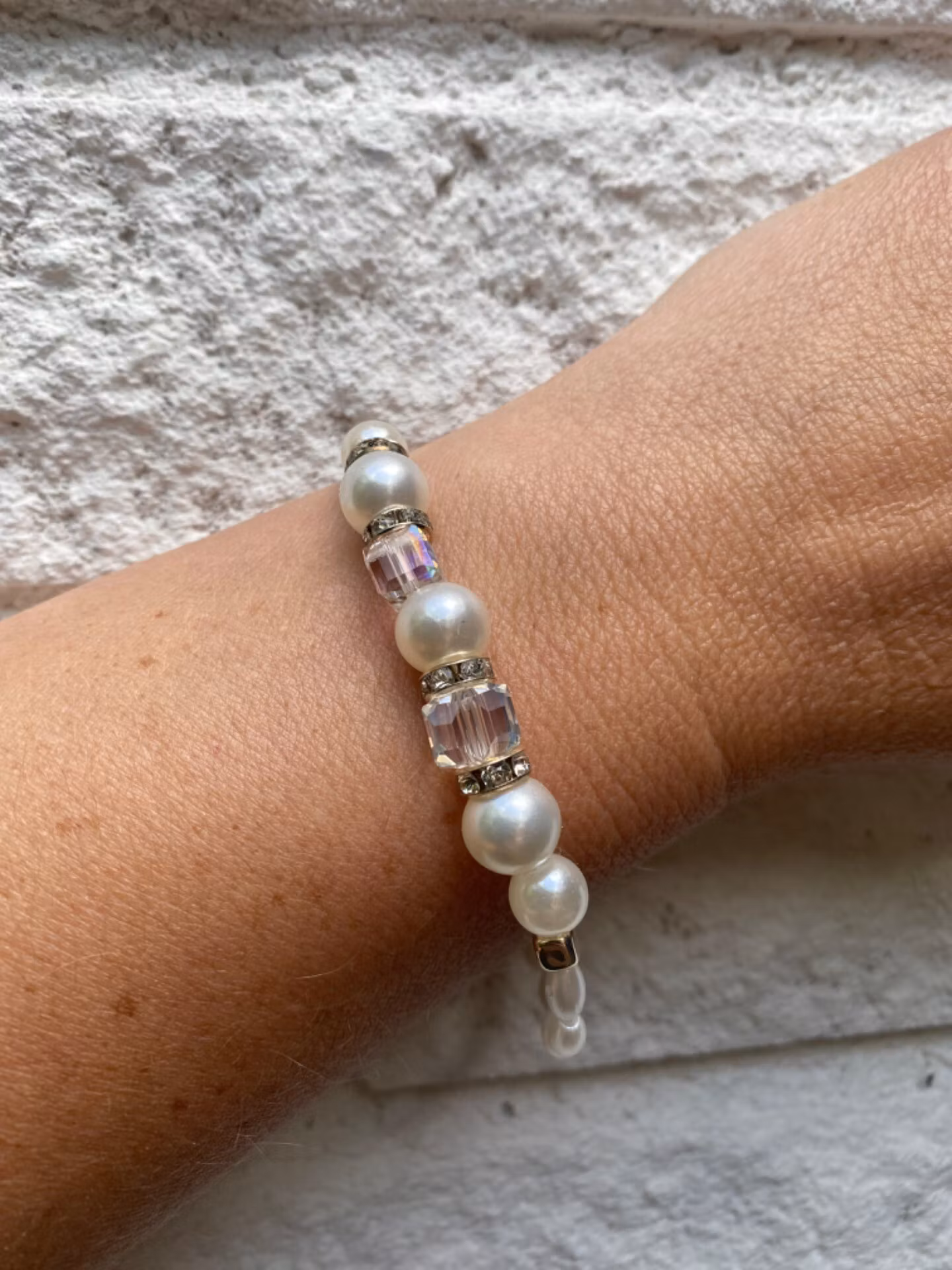 Beige runda och avlånga pärlor med silverfärgade strassdetaljer och fyrkantiga glaspärlorPärlor 8mm, 10mmVisas produkten "Tillfälligt slut" efter att du lagt de