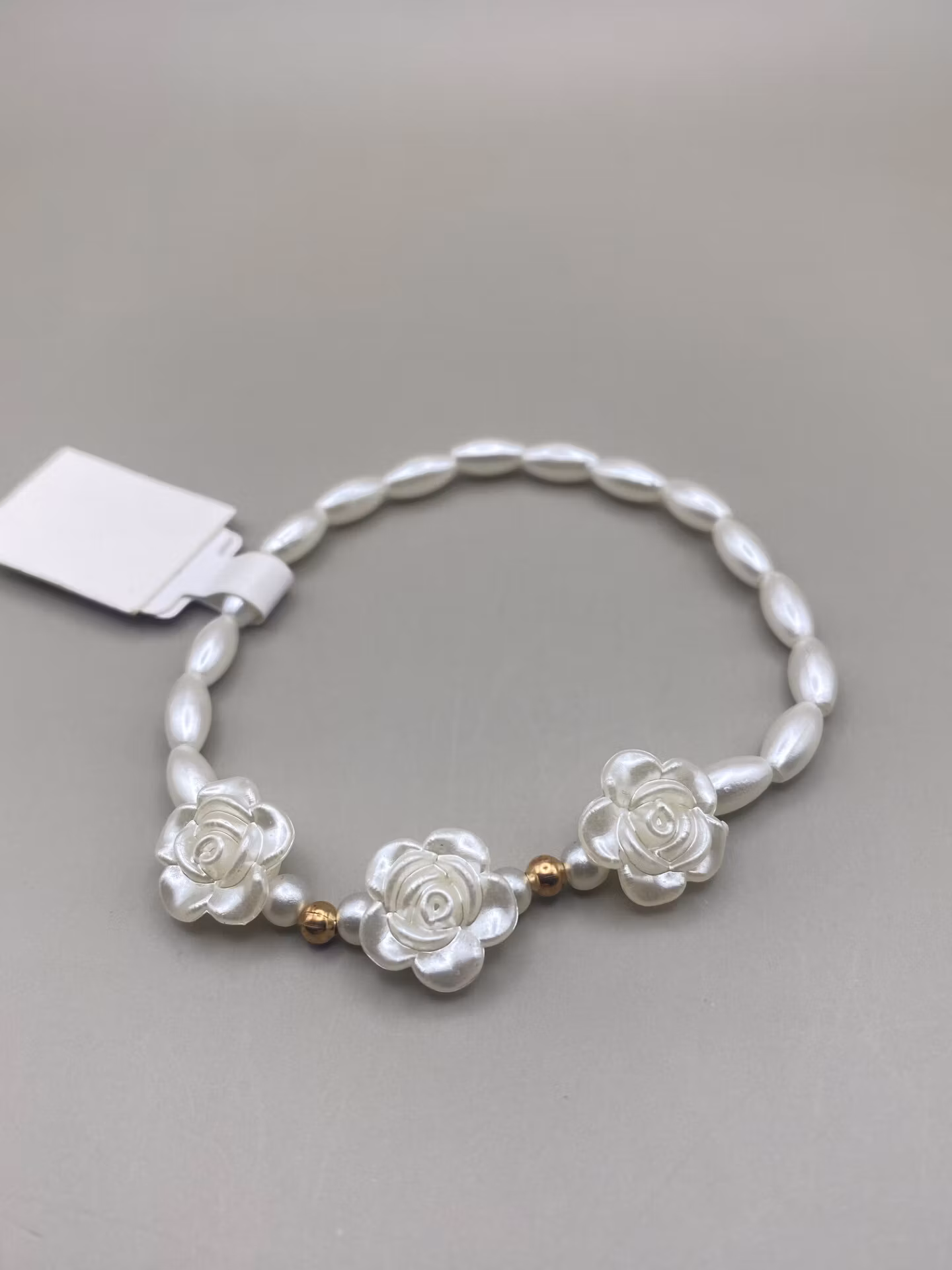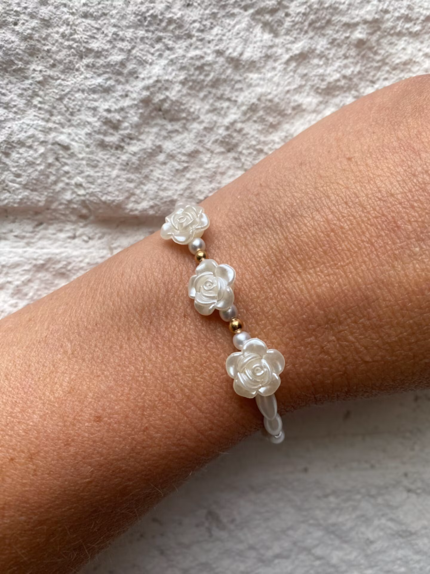 Armband i tjusigt benvita avlånga pärlor varvat med tre benvita rosor i blickfånget, guldfärgade detaljer