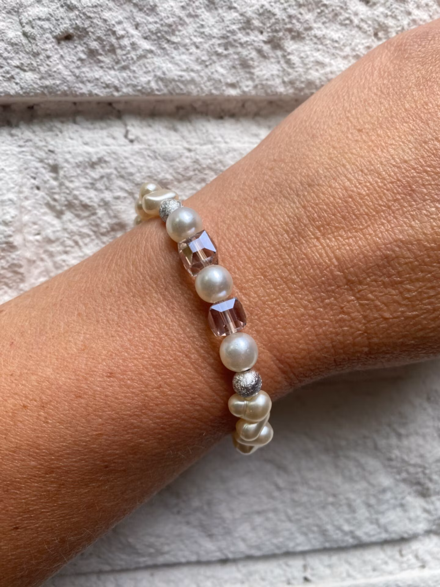 Armband av beiga oregelbundna pärlor, varvat med borstad silverfärgad pärla, benvita pärlor och mörkare genomskinlig rosa fyrkantiga pärlor i blickfånget