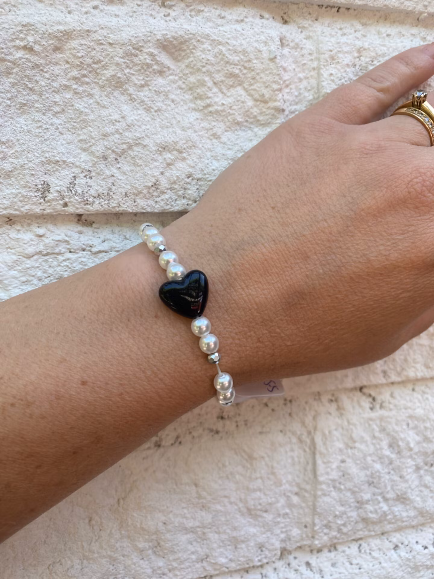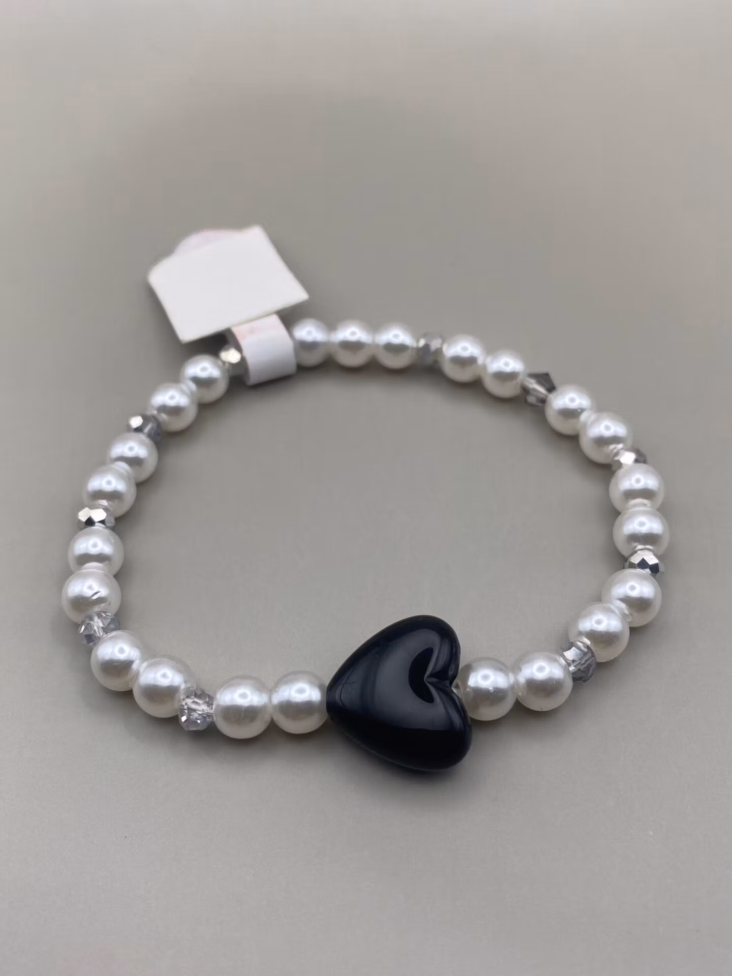 Armband av vita pärlor varvat med silvergrå mindre glaspärlor, svart glansigt hjärta i blickfånget