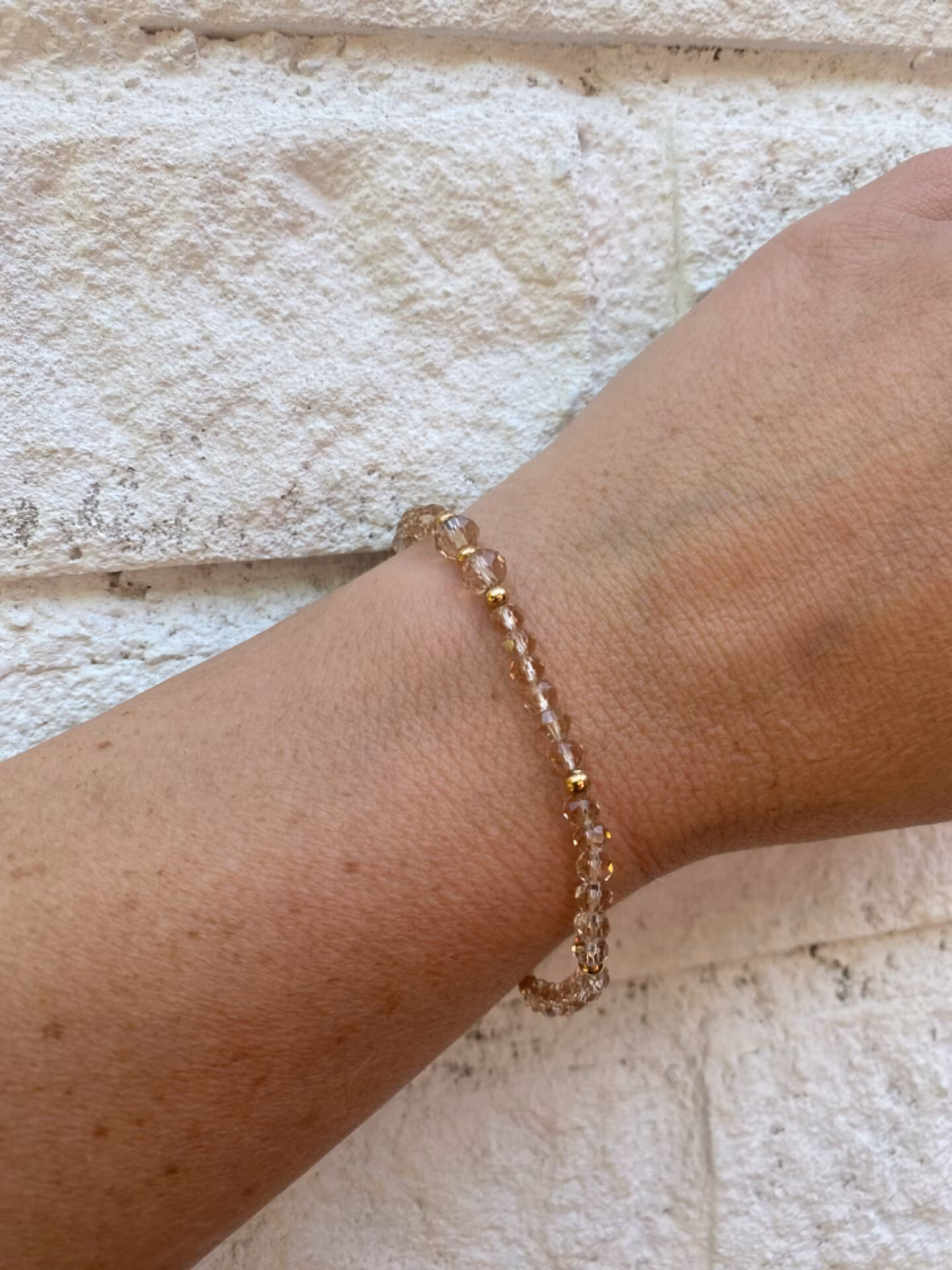 Diskret armband i mindre champagnefärgade glaspärlor varvat med små guldfärgade pärlor samt något större glaspärlor i blickfånget.