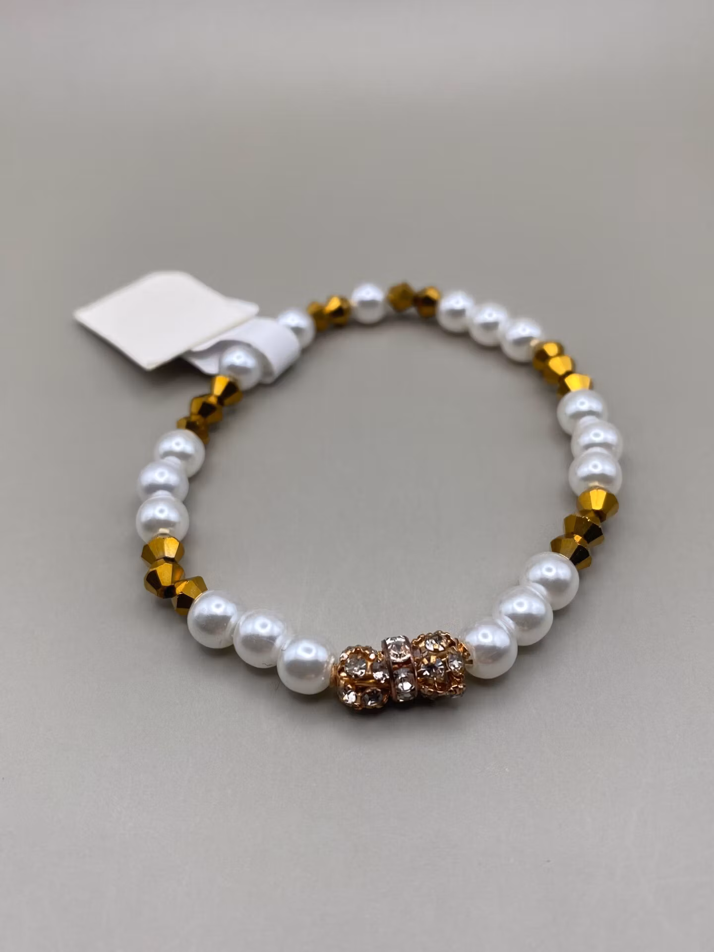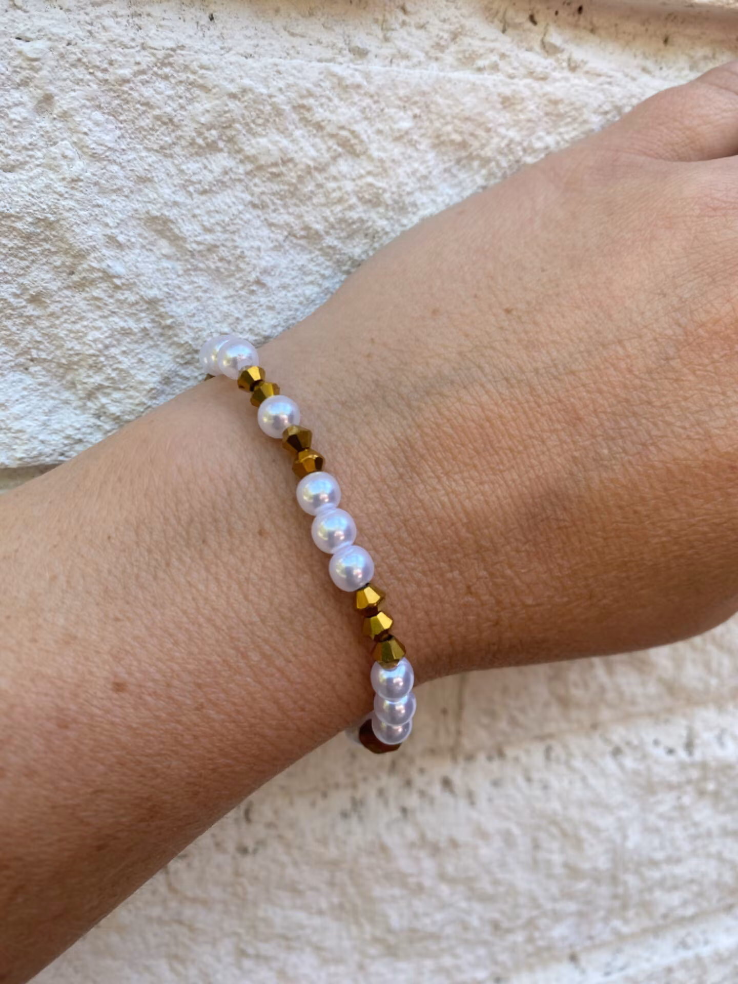 Armband i kritvita pärlor varvat med guldfärgade glaspärlor. Guldbollar och strass i blickfånget