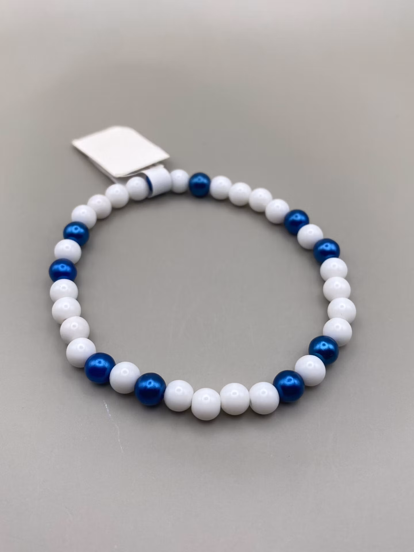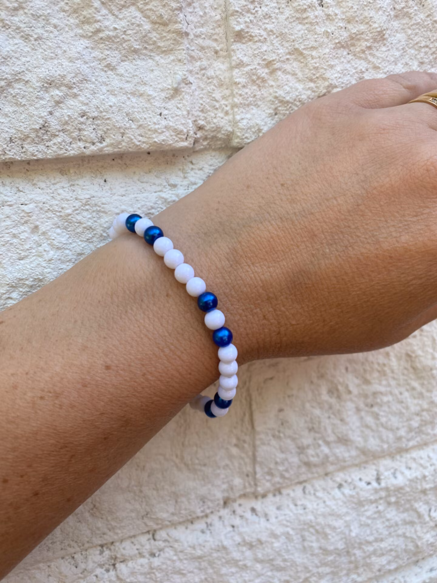 Armband i vita pärlor varvat med koboltblå pärlor