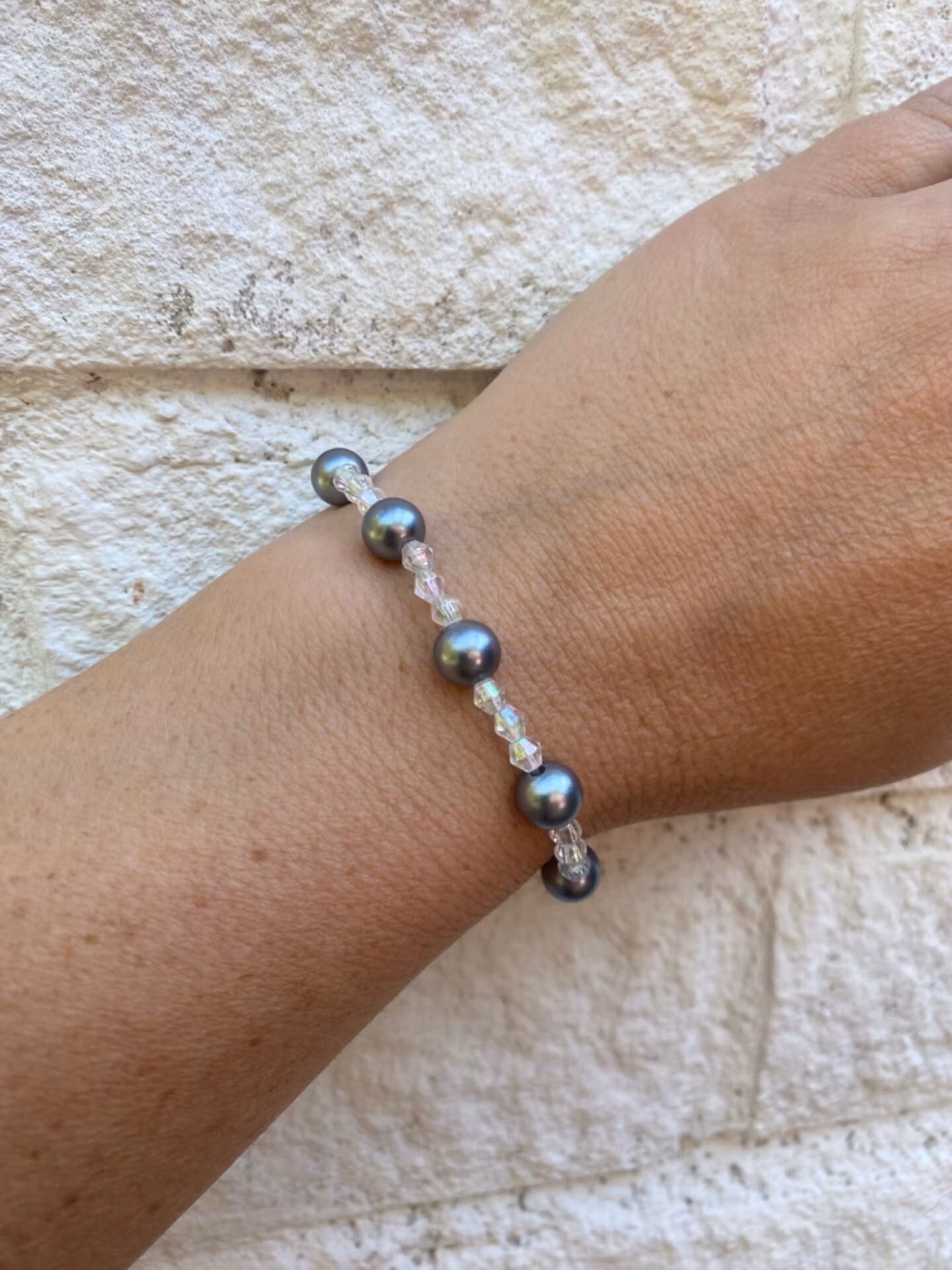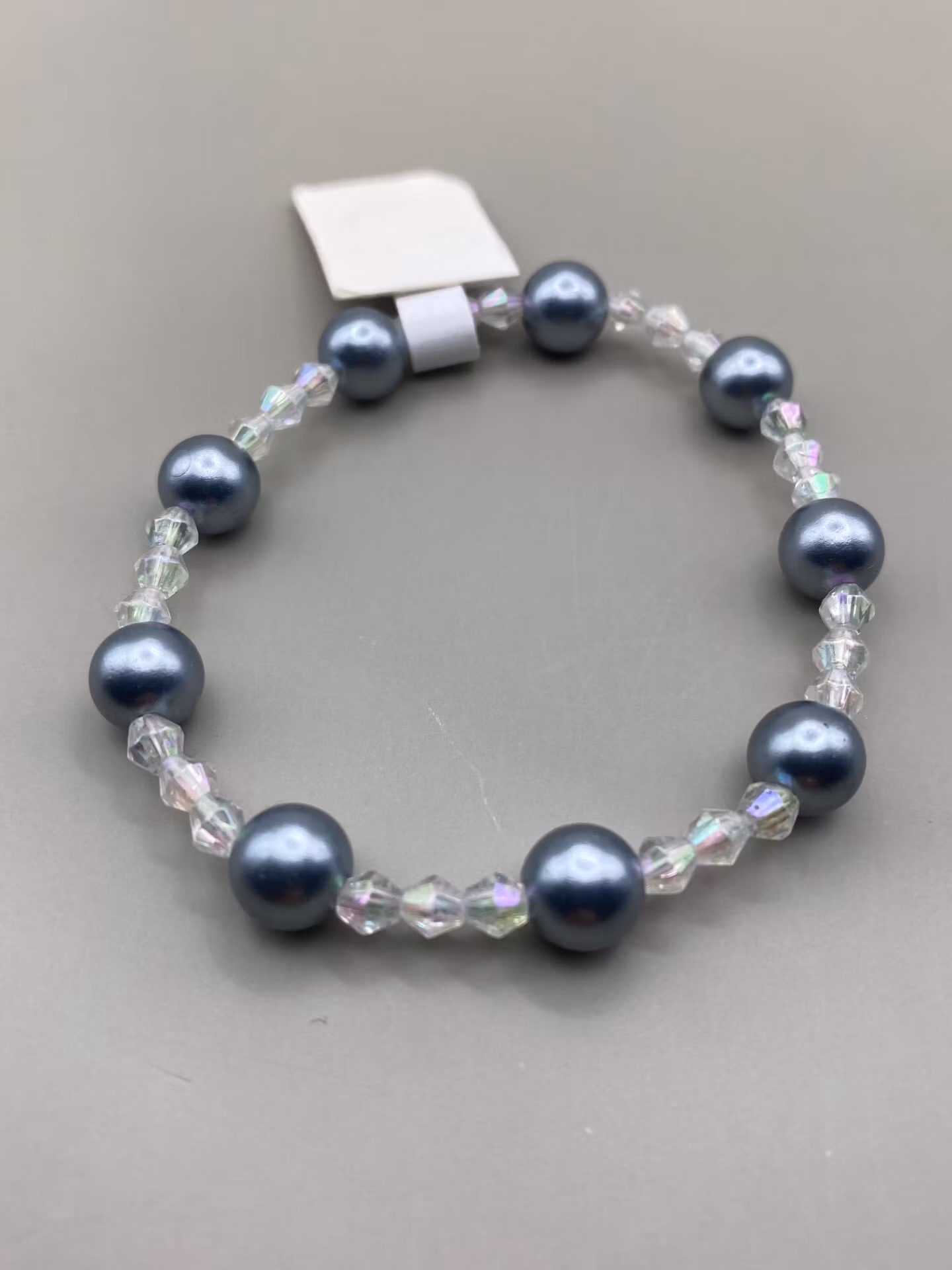 silvergrå pärlor varvat med genomskinliga glansiga pärlor
