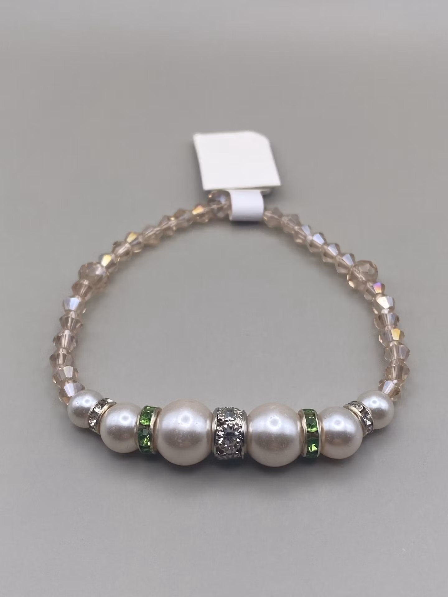 Ljusrosa pärlor med strassdetaljer i silver och grönt, ljusrosa glaspärlor