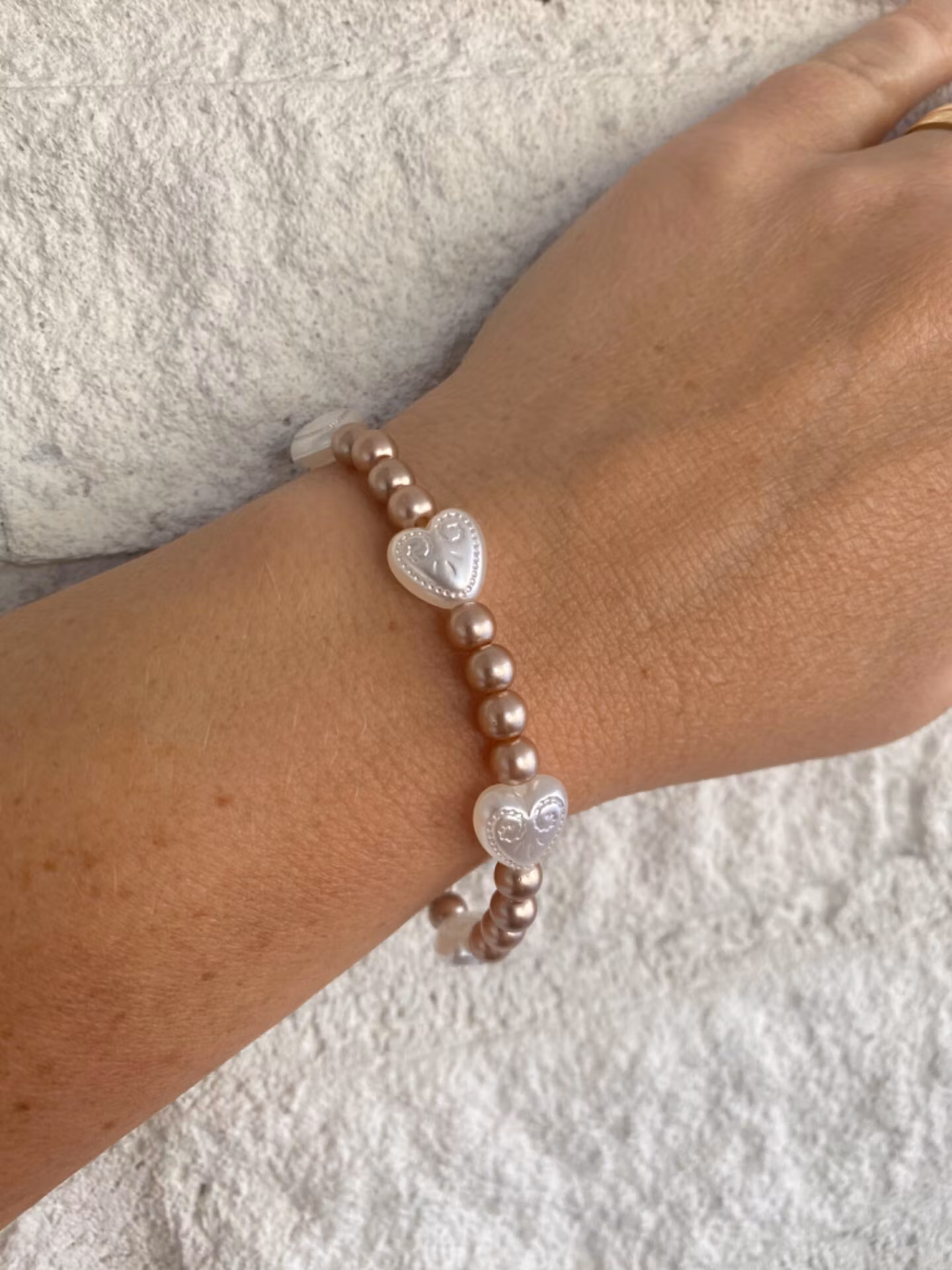 Armband i beiga pärlor varvat med vita mönstrade hjärtan