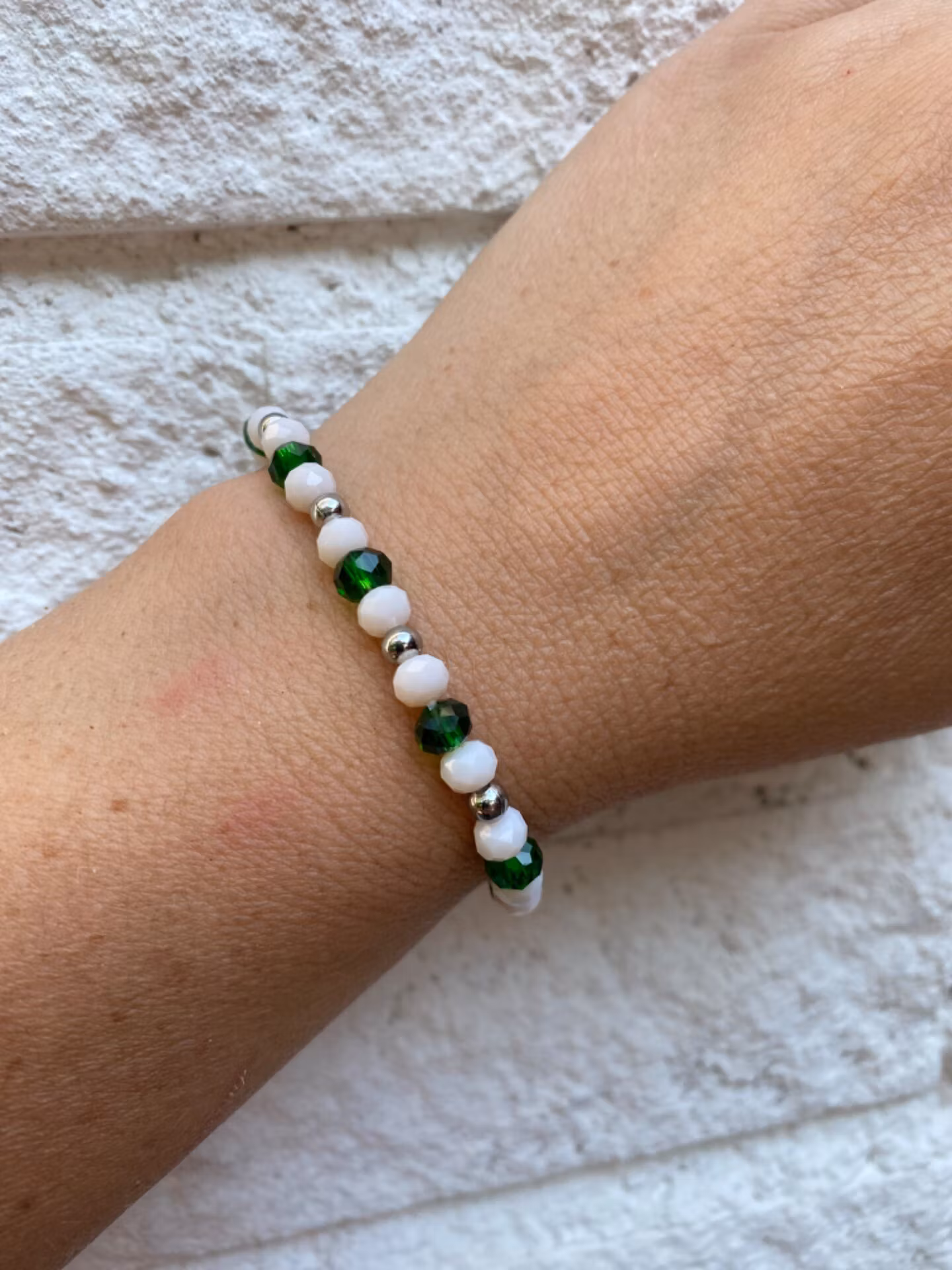 Armband i varvat mönster av mindre pärlor, gröna glaspärlor, vita pärlor och silverfärgade pärlorPärlor 6mmVisas produkten "Tillfälligt slut" efter att du lagt