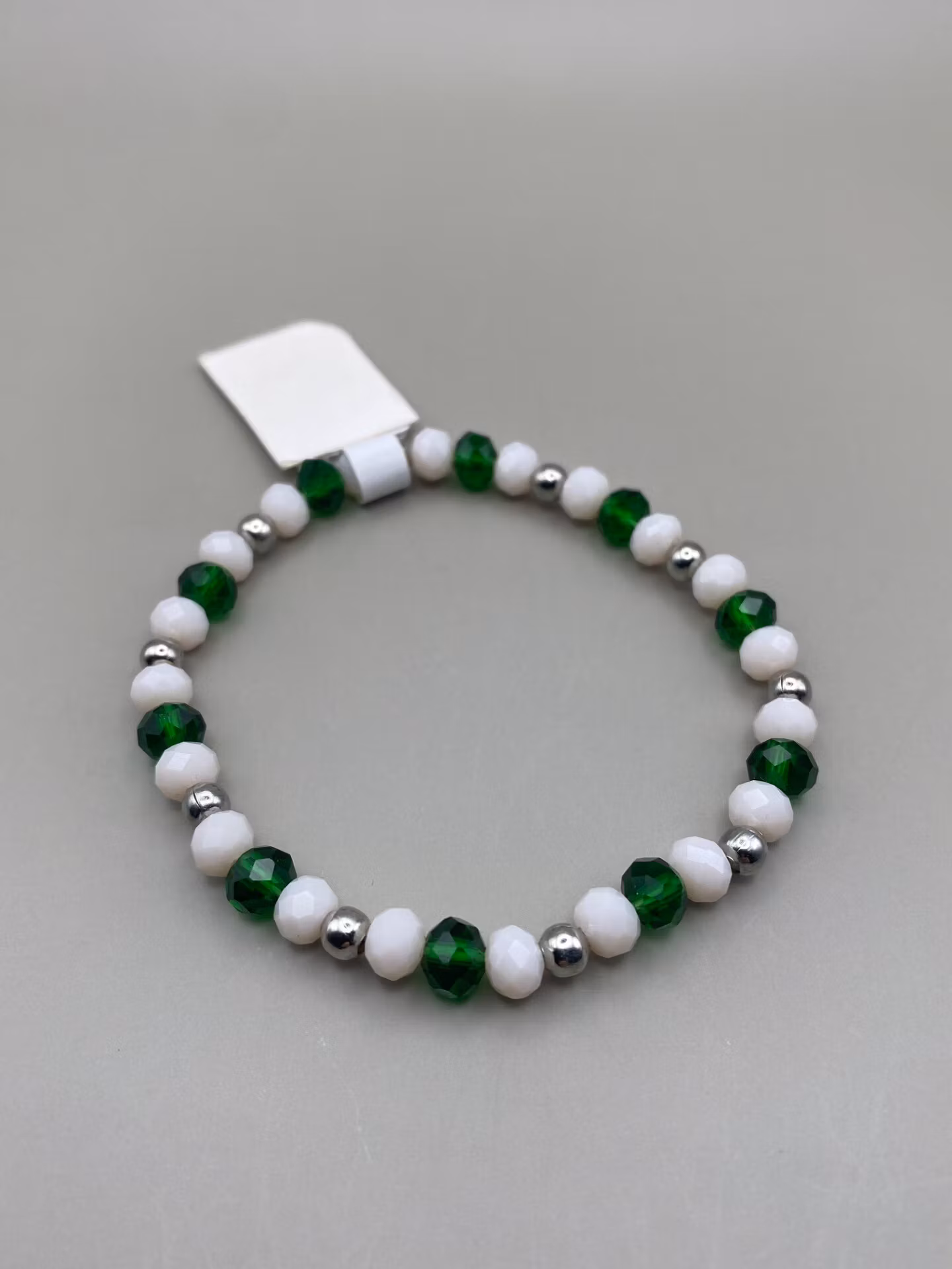 Armband i varvat mönster av mindre pärlor, gröna glaspärlor, vita pärlor och silverfärgade pärlor