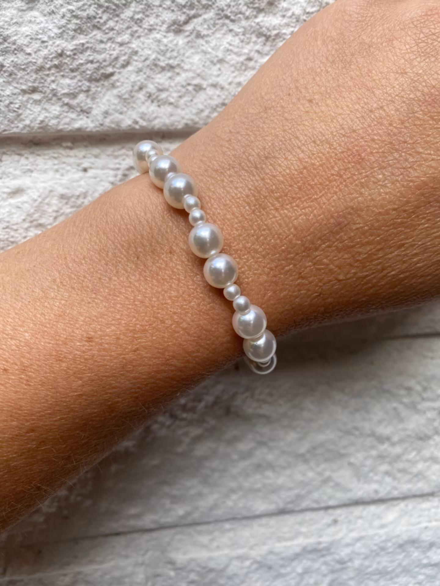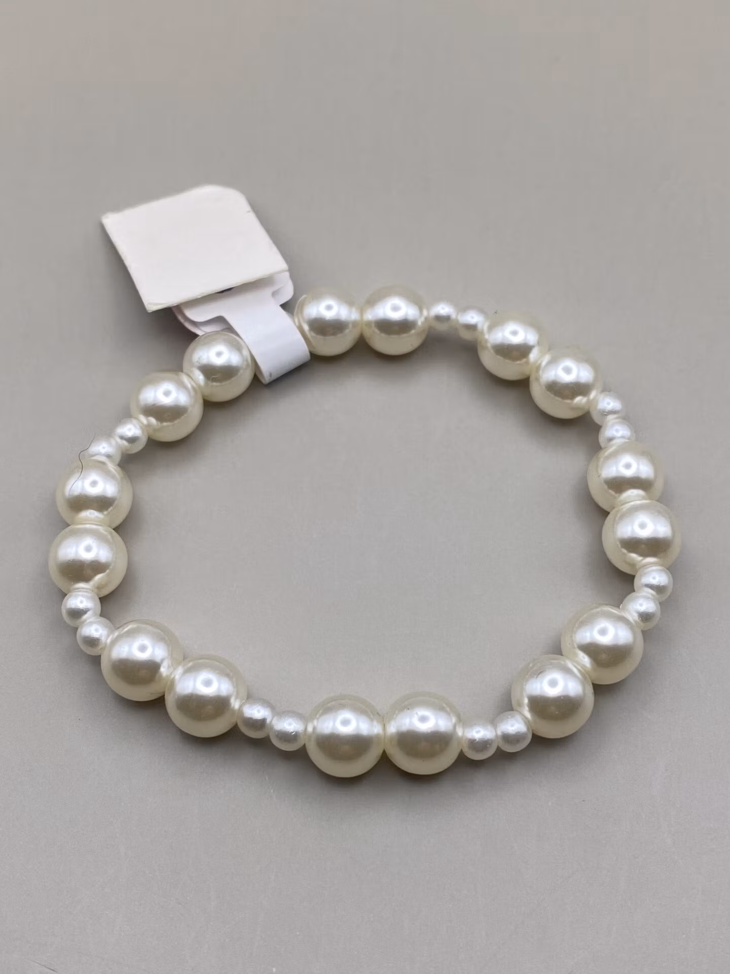 Armband i kritvita vaxade pärlor, mönster av mellanstora pärlor varvat med små lika pärlor.
