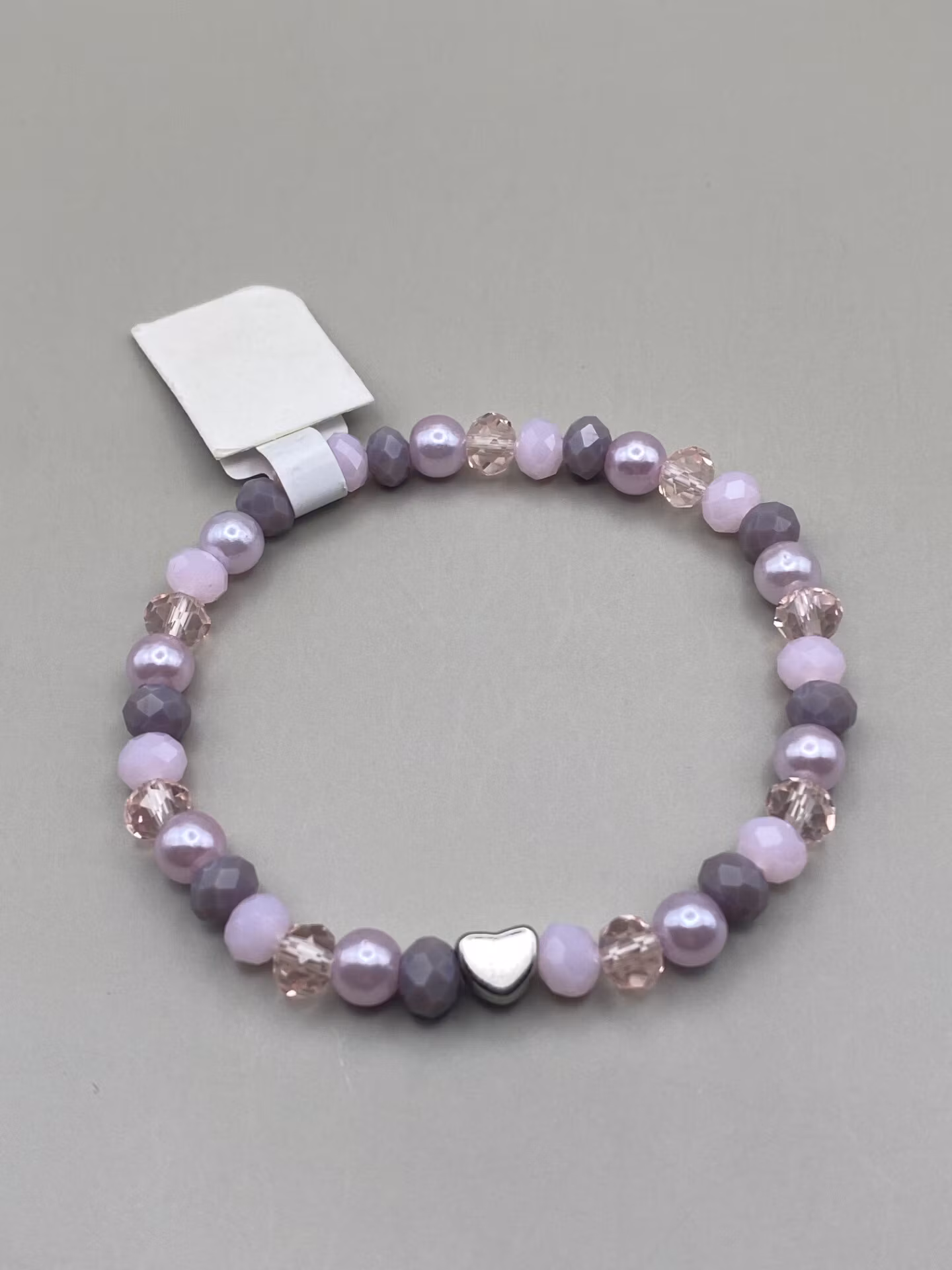 Armband i pastellrosa och lila toner, lila och ljusrosa glaspärlor, sött litet silverfärgat hjärta i blickfånget eller baktill.