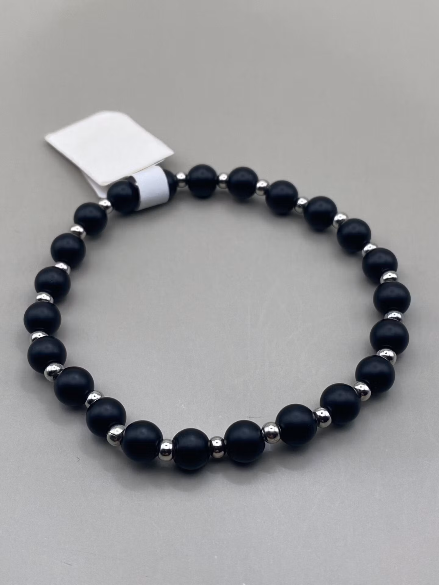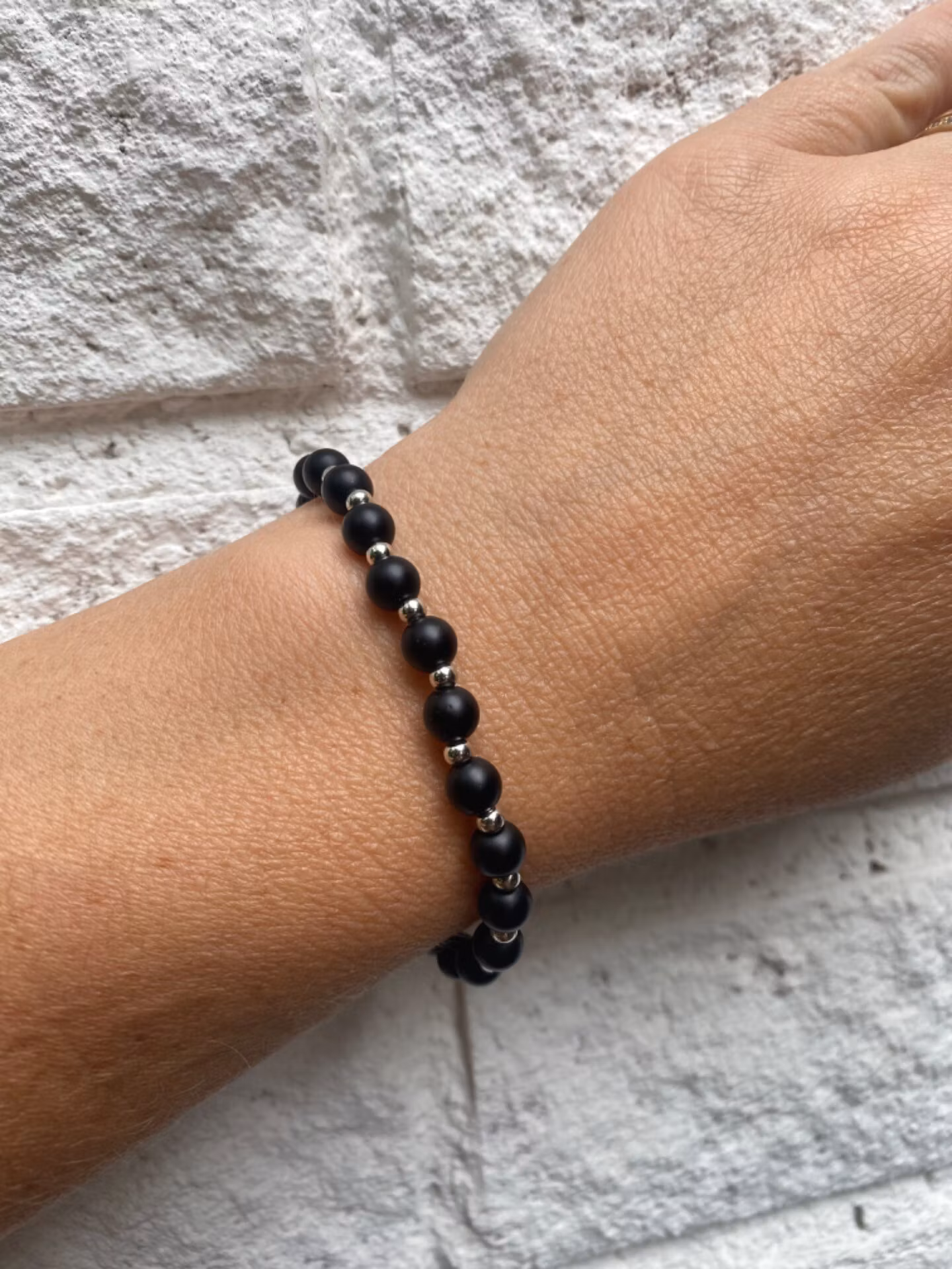 Armband av svarta halvmatta mindre pärlor varvat med små silverfärgade pärlor