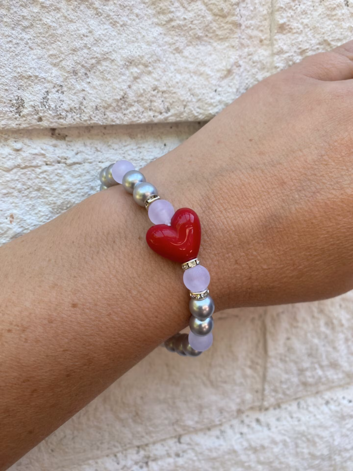 Silvergrå pärlor varvat med vita frostade och klara pärlor med rött hjärta