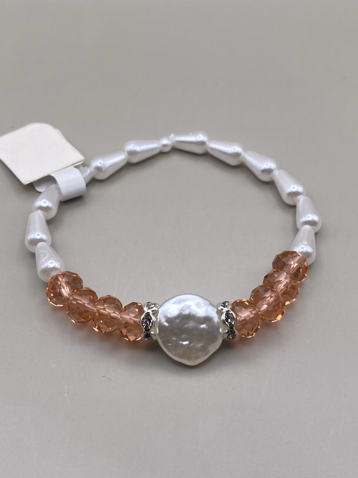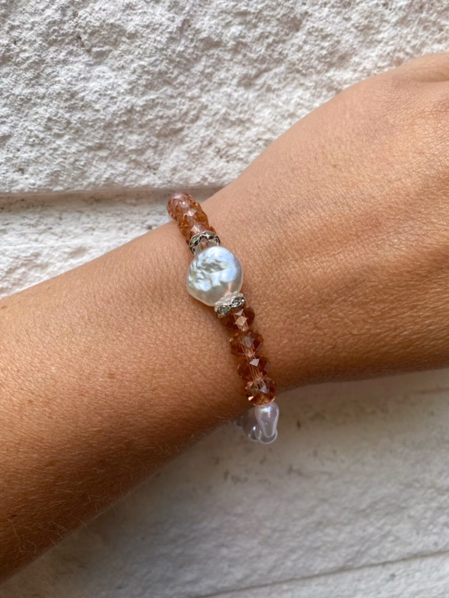 Armband av orange/aprikosa glaspärlor och stor vit vaxad pärla i blickfånget. Konformade vita pärlor runt omPärlor 8mmVisas produkten "Tillfälligt slut" efter a