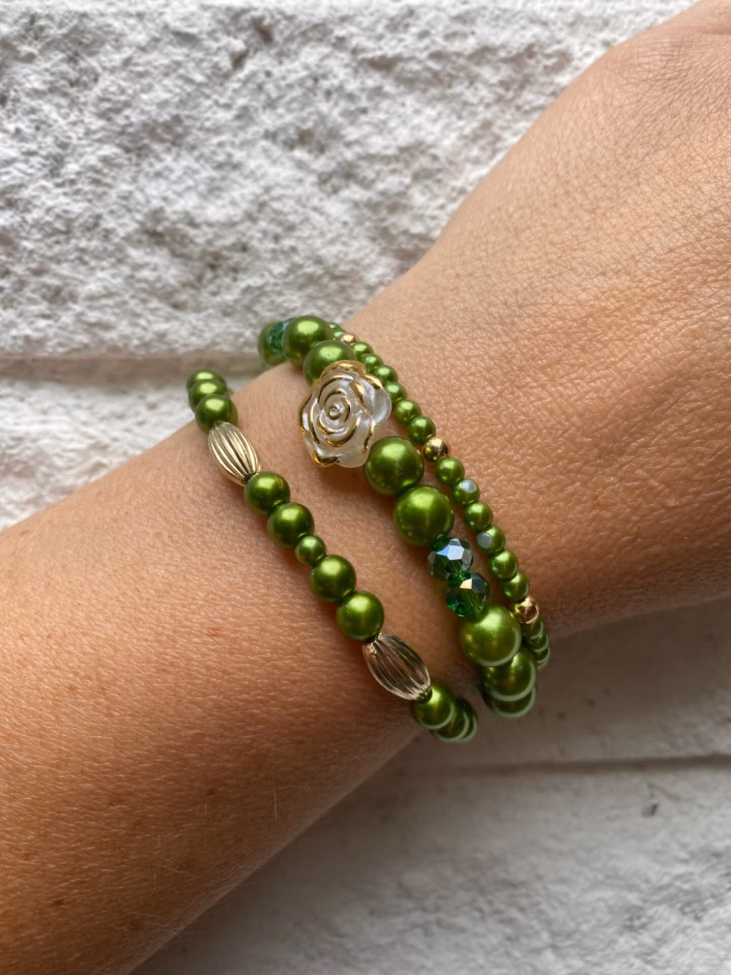 Armband i härligt gröna pärlor varvat med större guldfärgade mönstrade pärlor