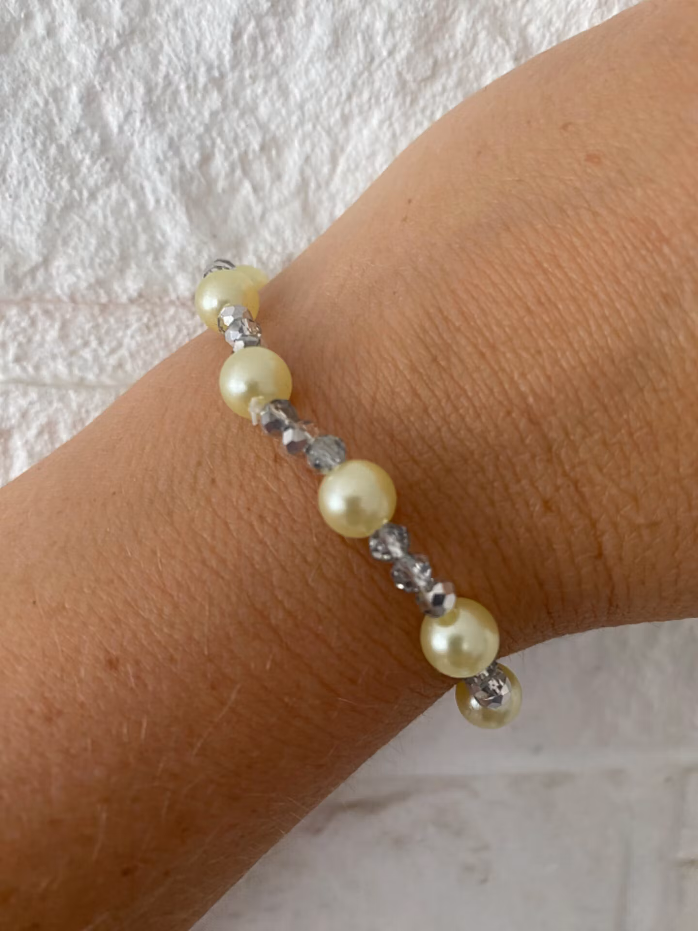 Fint armband i fint mönster av ljusgula pärlor och små silverfärgade glaspärlor.
