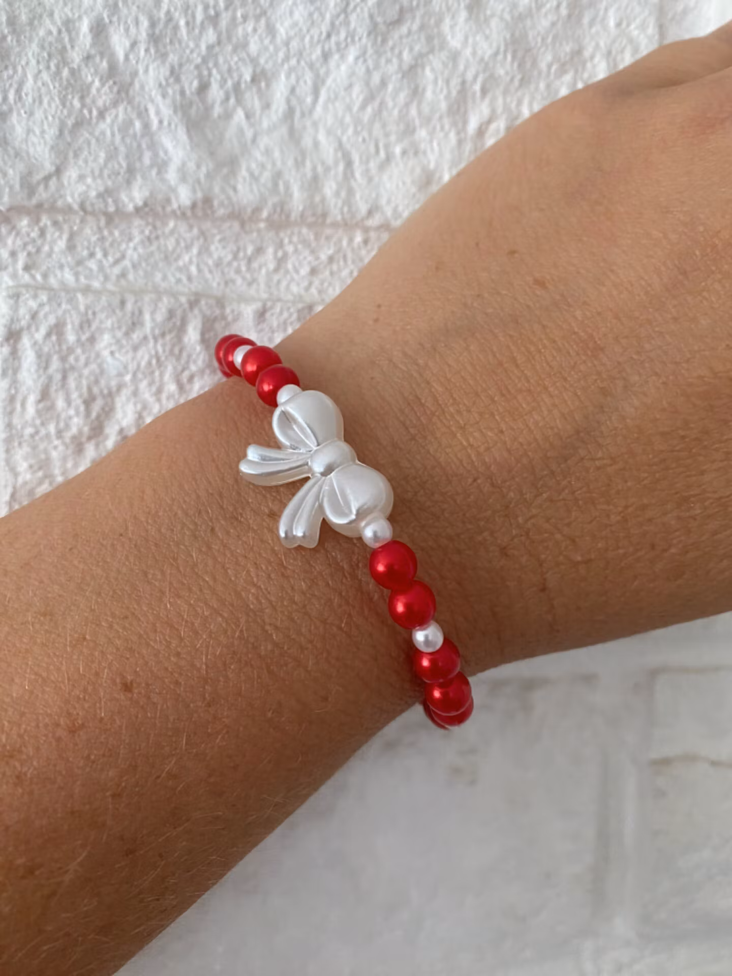 Armband i röda pärlor varvat med vita små pärlor och vit rosett i blickfånget. Ger en känsla av jul.