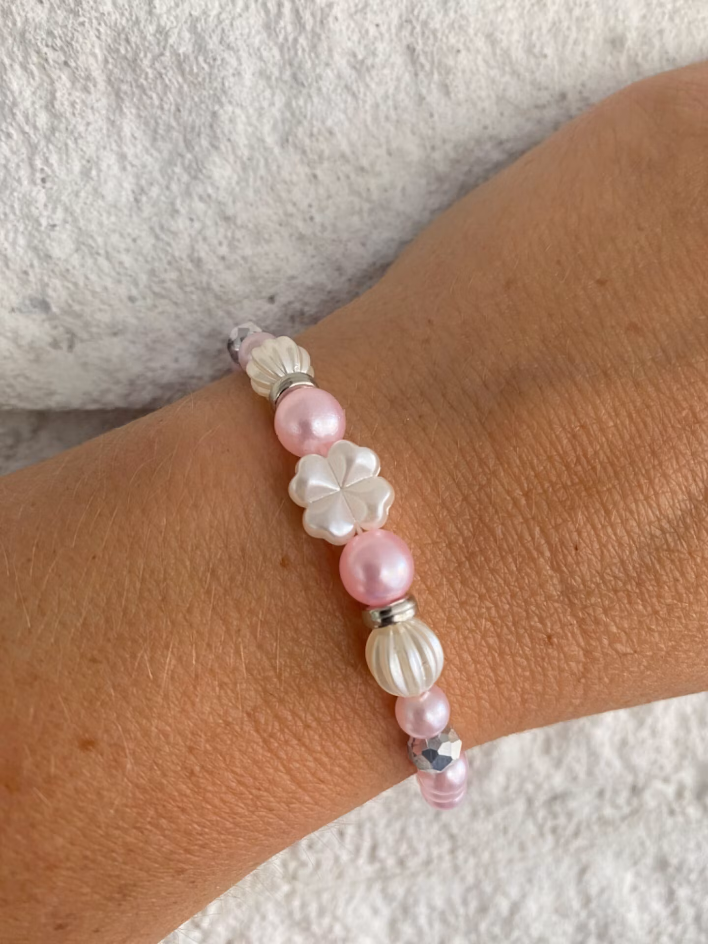 Fint armband i ljusrosa pärlor runt om. Större rosa pärlor i mönster med silvergrå glasärlor och silverfärgadee detaljer, vita räfflade pärlor samt vit fyrklöver i blickfånget