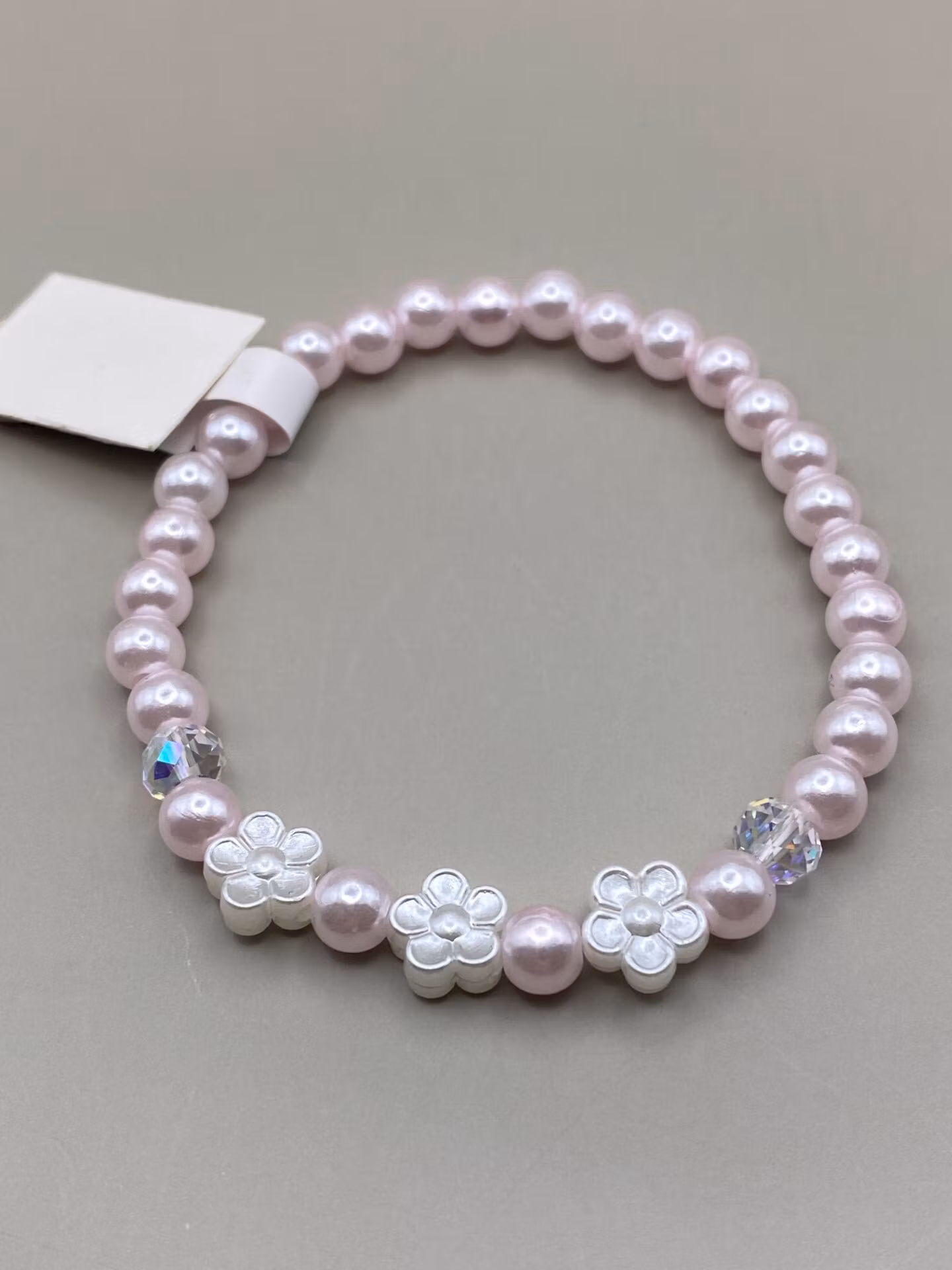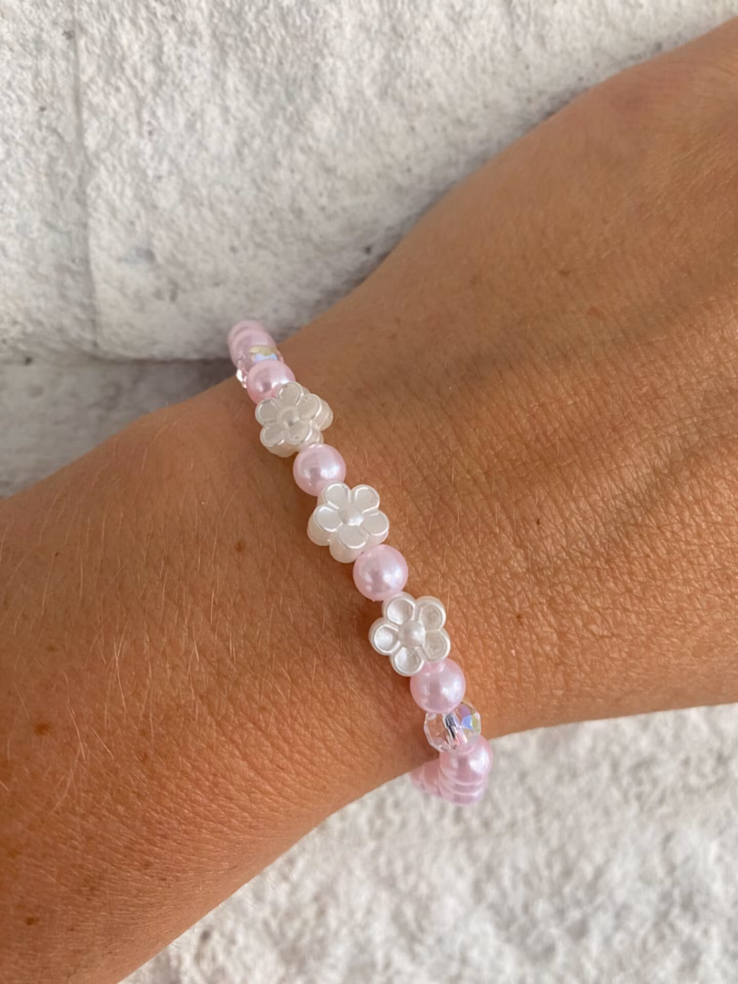 Fint armband i pastellrosa pärlor, tre vita blommor samt två glaspärlor i blickfånget.