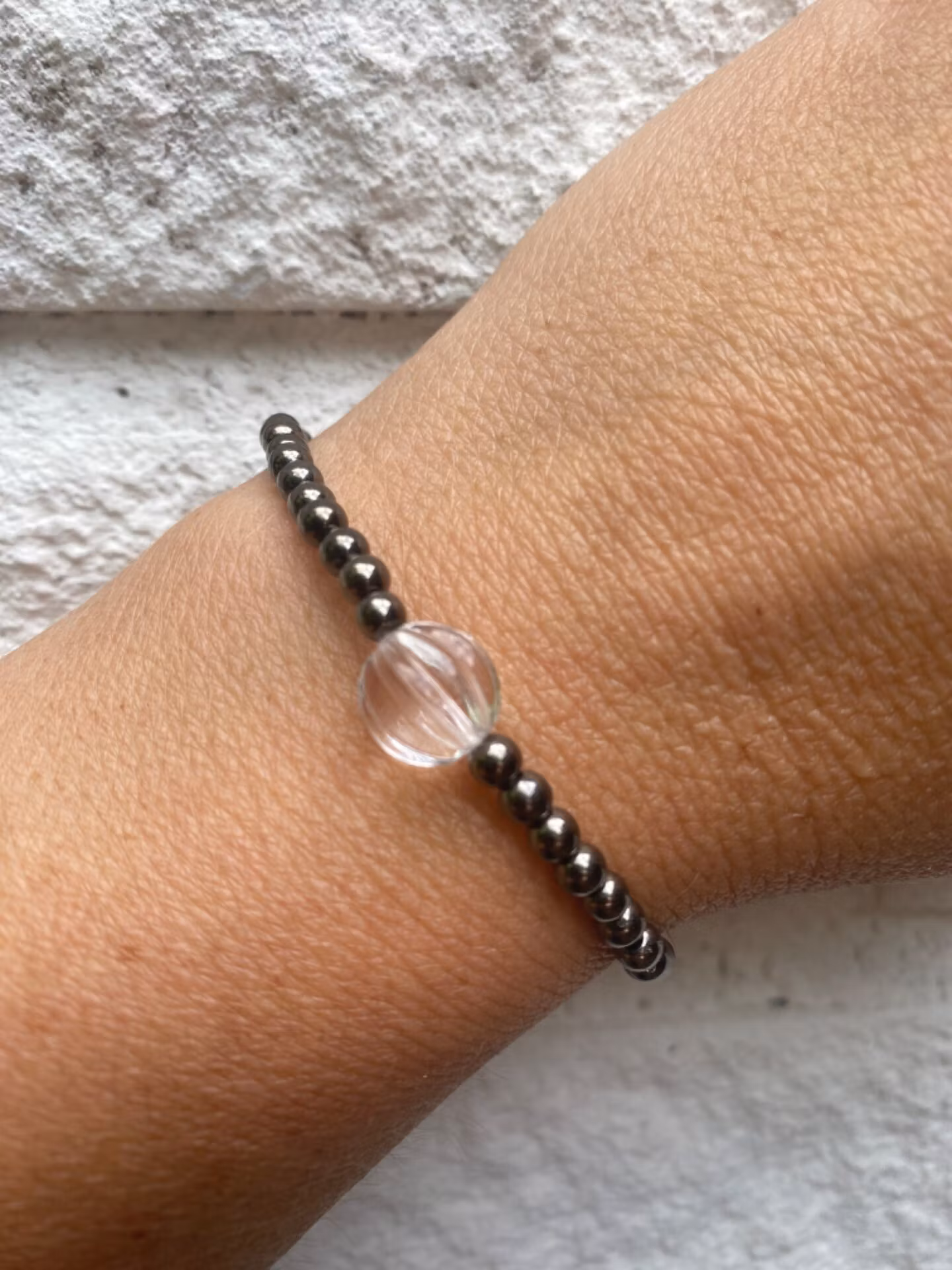Snyggt, enkelt och diskret armband i metallsvarta små pärlor och stor räfflad genomskinlig pärla i blickfånget.Pärlor 4mmVisas produkten "Tillfälligt slut" efte
