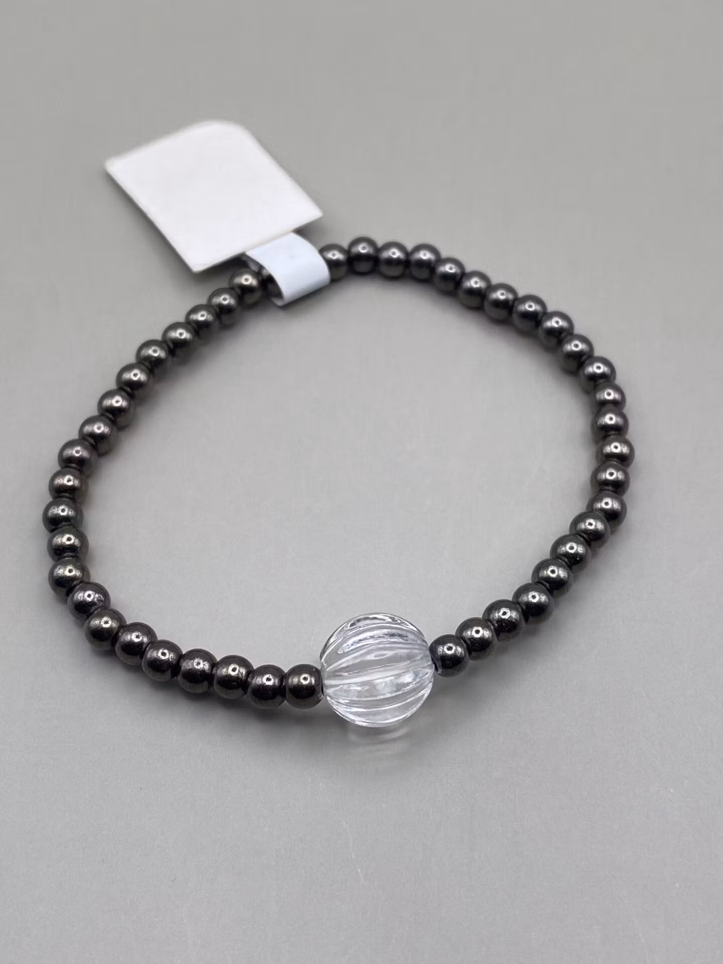 Snyggt, enkelt och diskret armband i metallsvarta små pärlor och stor räfflad genomskinlig pärla i blickfånget.