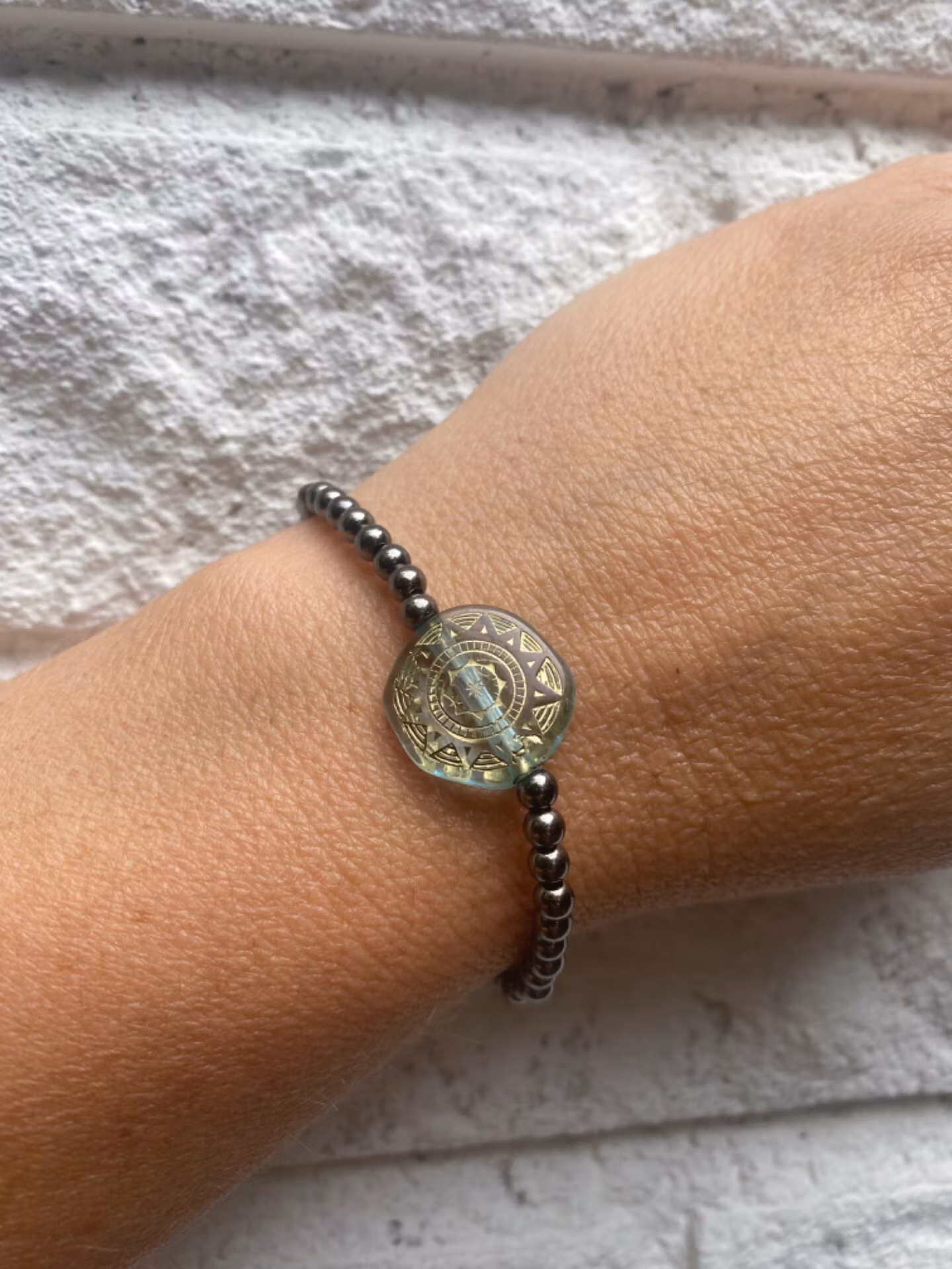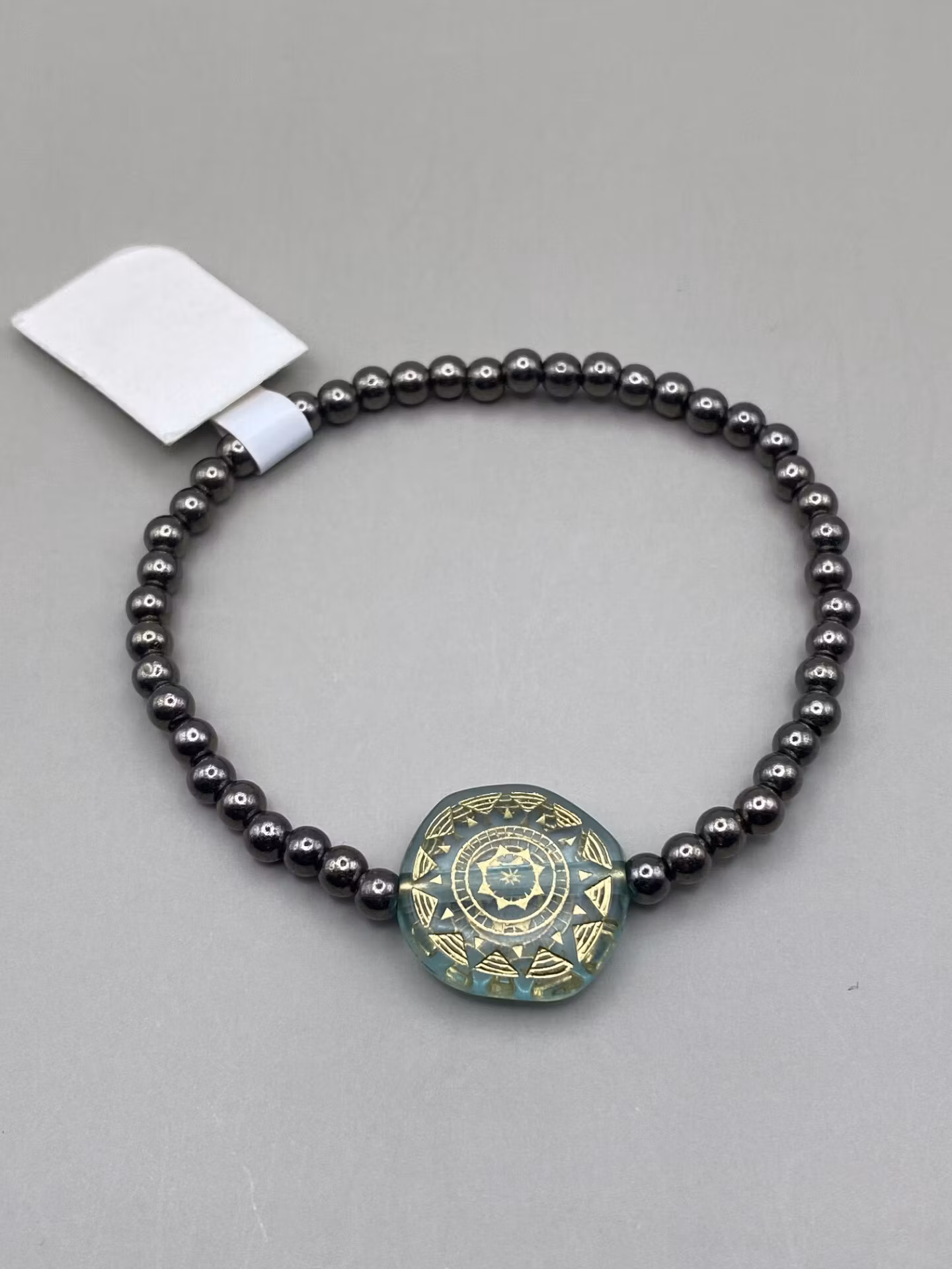 Snyggt, enkelt och diskret armband i metallsvarta små pärlor och stor platt svagt turkos genomskinlig pärla med guldfärgat mönster i blickfånget.