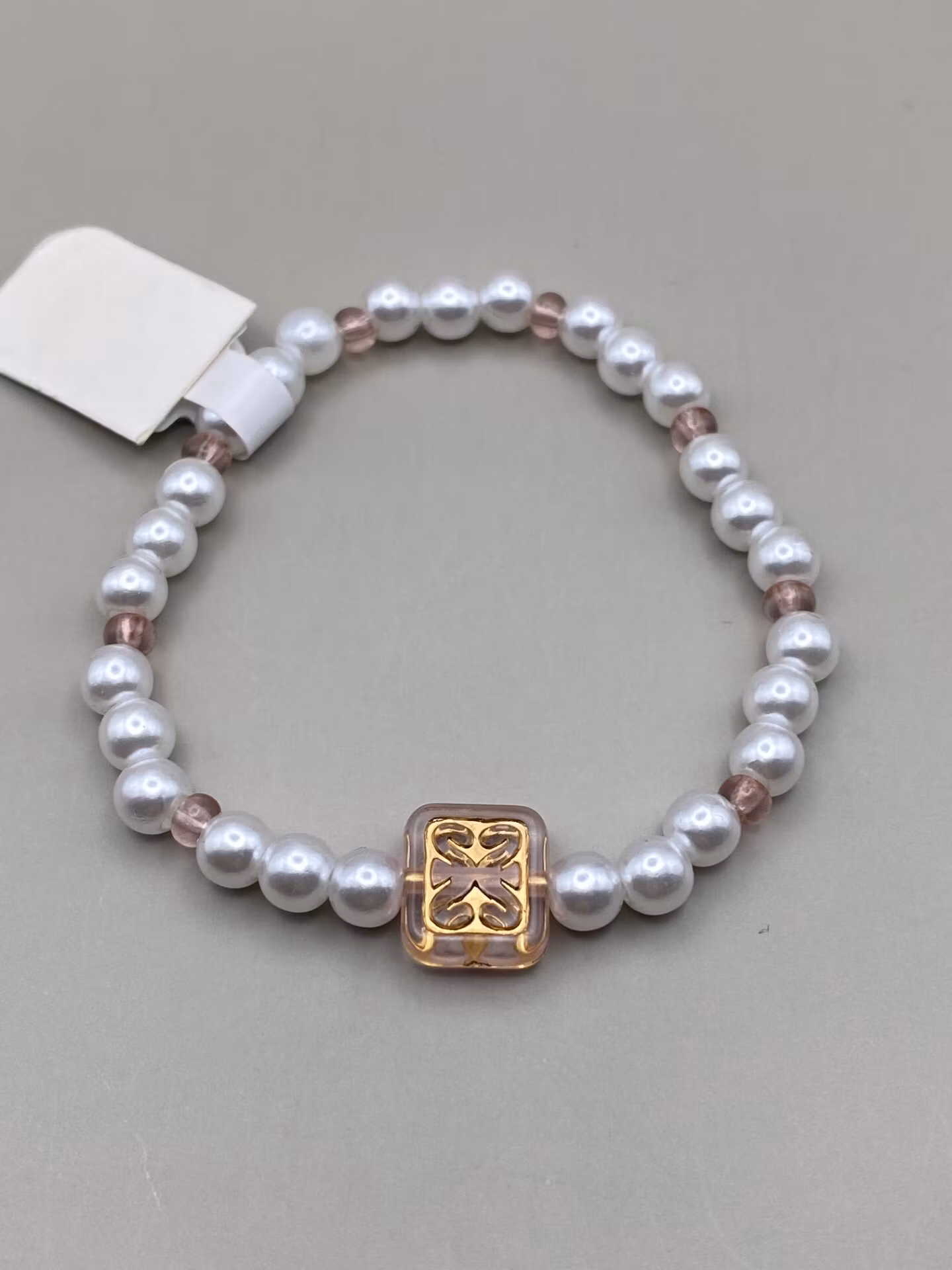 Fint enkelt armband i kritvita högblanka mindre pärlor varvat med gammelrosa glaspärlor och större fyrkantig platt gammelrosa pärla med guldfärgat mönster i blickfånget