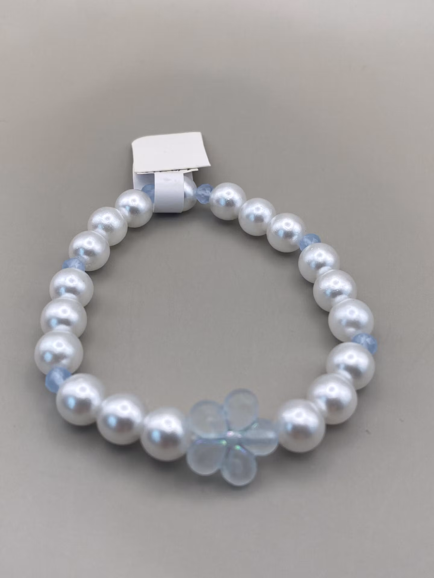 Fint och enkelt armband i kritvita högblanka stora pärlor varvat med små ljusblå glaspärlor och en fin ljusblå blomma i blickfånget