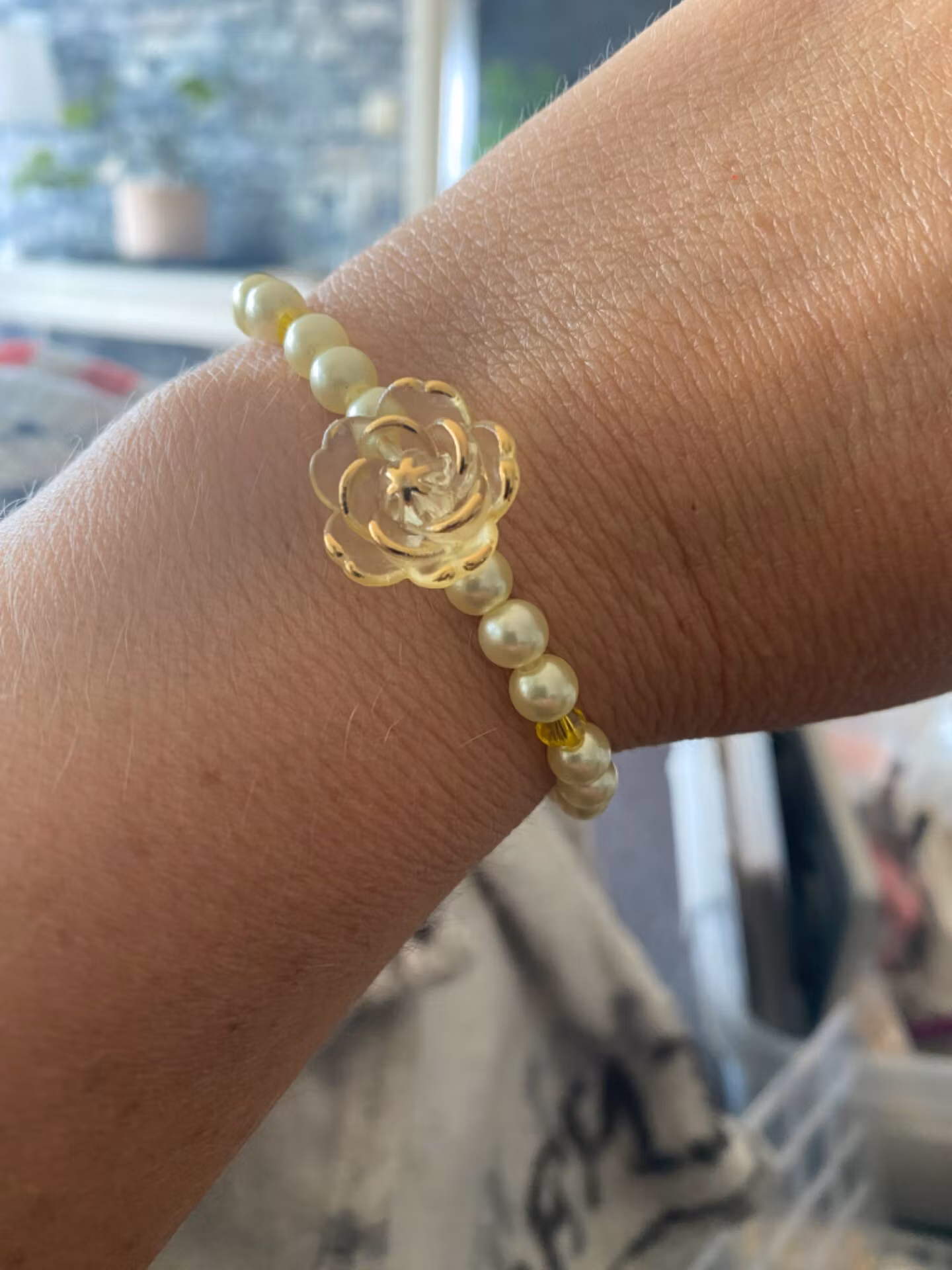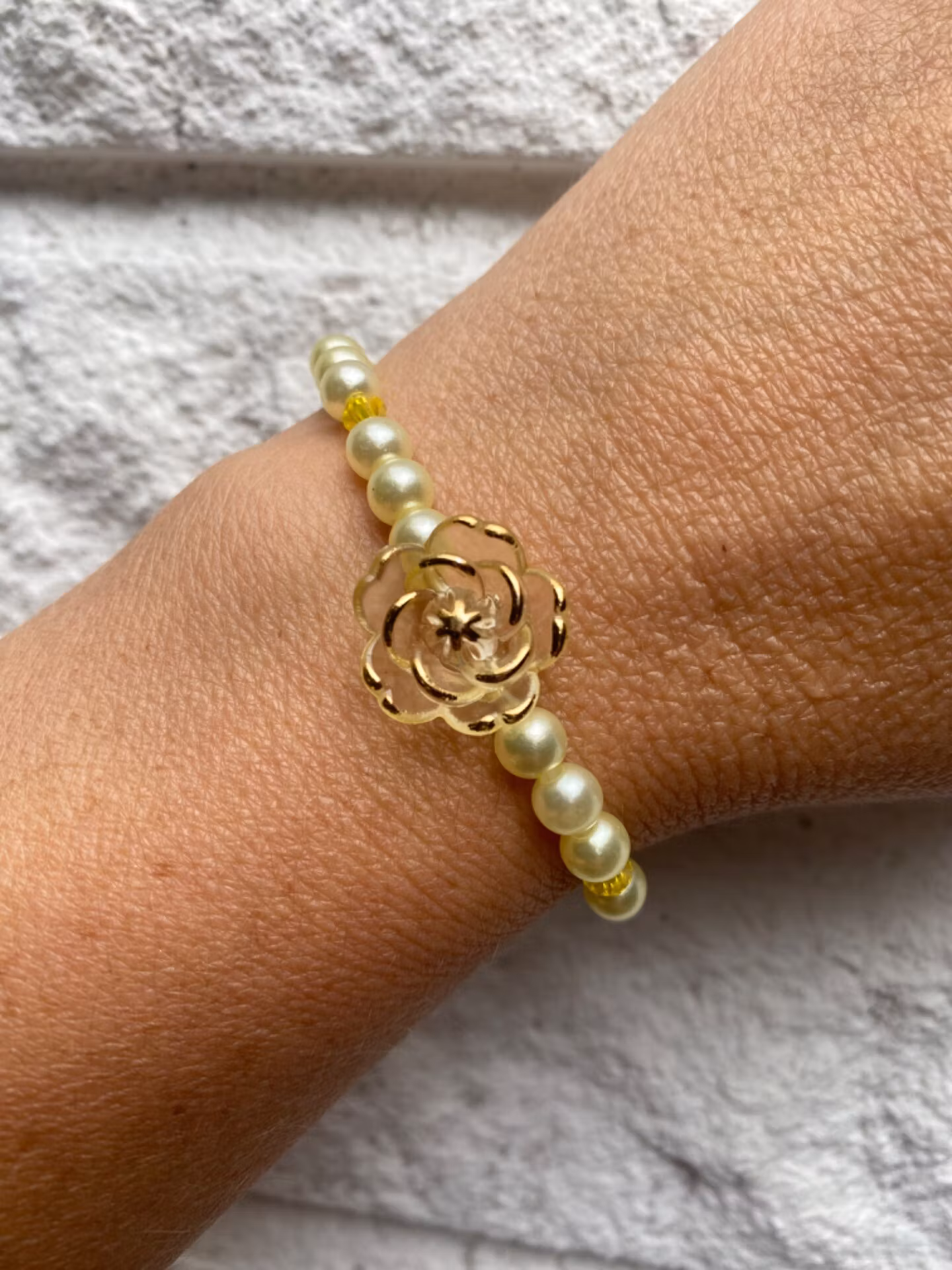 Härligt armband i ljusgula mindre pärlor varvat med klargula små pärlor och stor ljust gul blomma med guldfärgade kanter i blickfånget.Pärlor 6mmVisas produkten