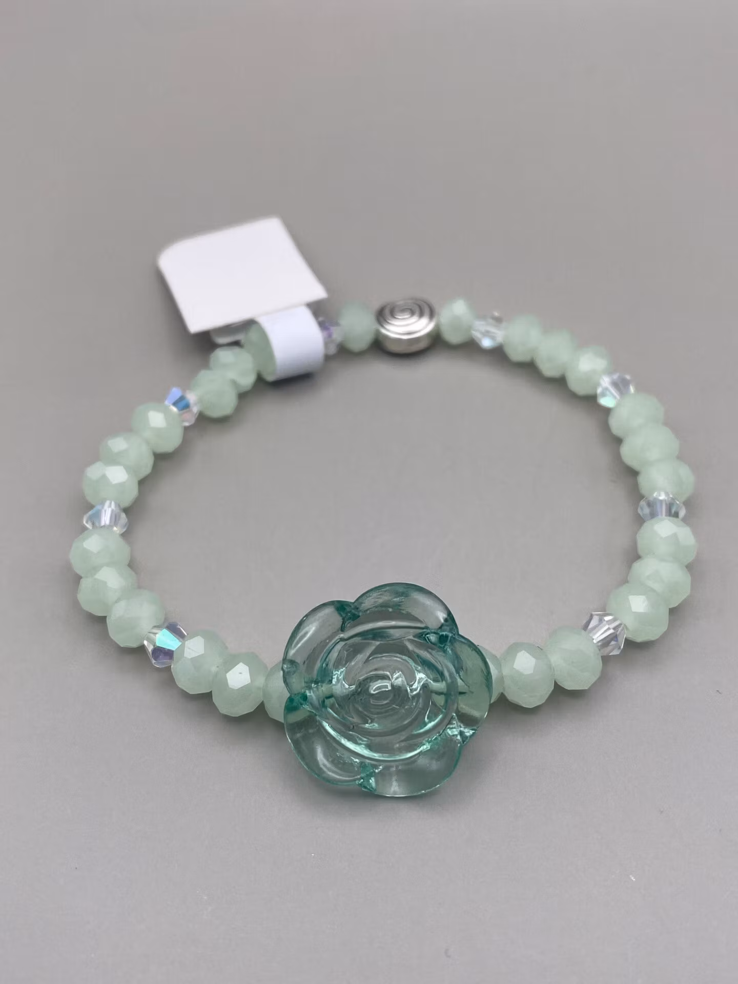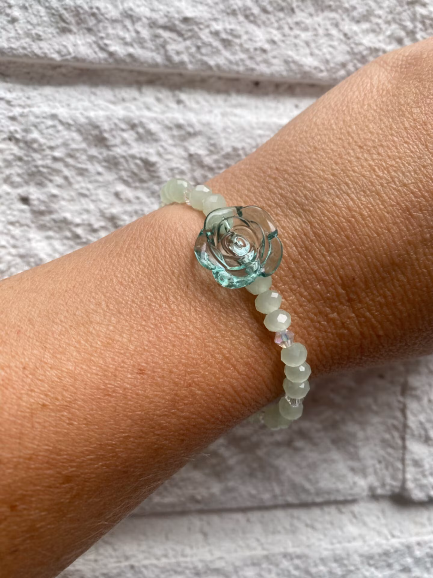 Härligt armband i ljusgröna mindre glaspärlor varvat med genomskinliga små pärlor och stor genomskinlig grön blomma i blickfånget.