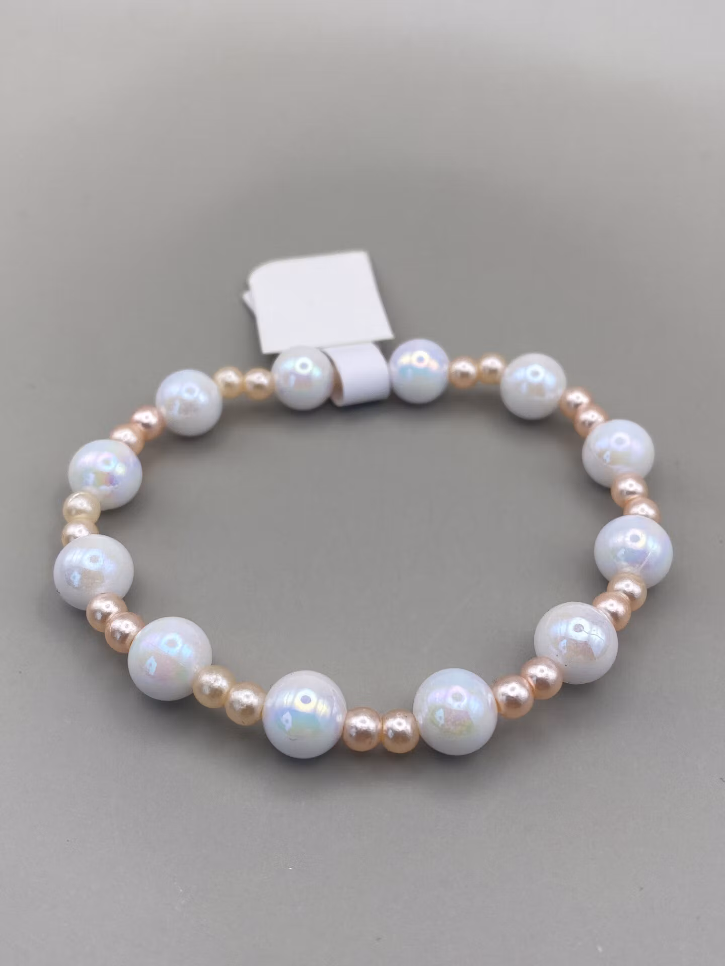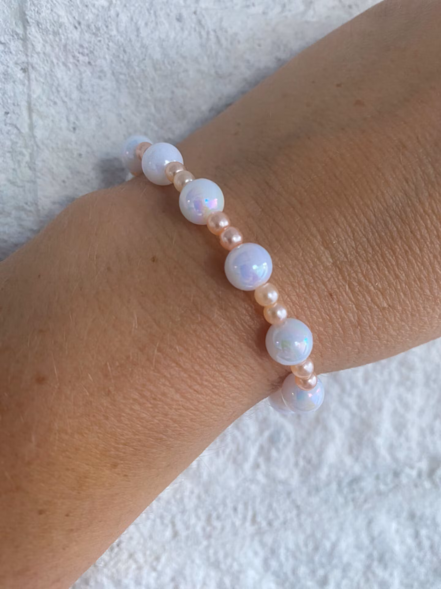 Fint armband i varvat mönster av vita hologramiska porslinsliknande pärlor varvat med små aprikosfärgade pärlor.