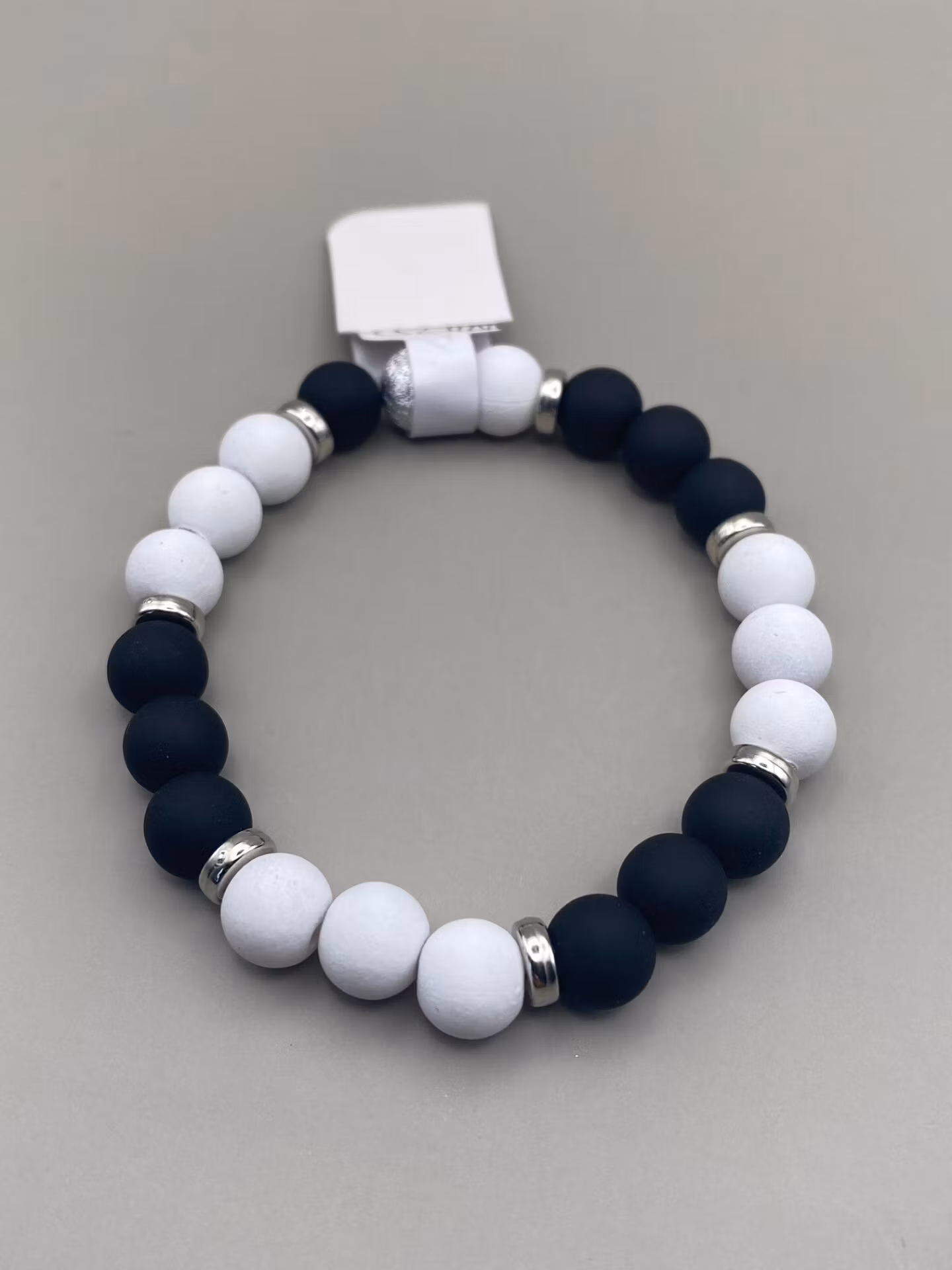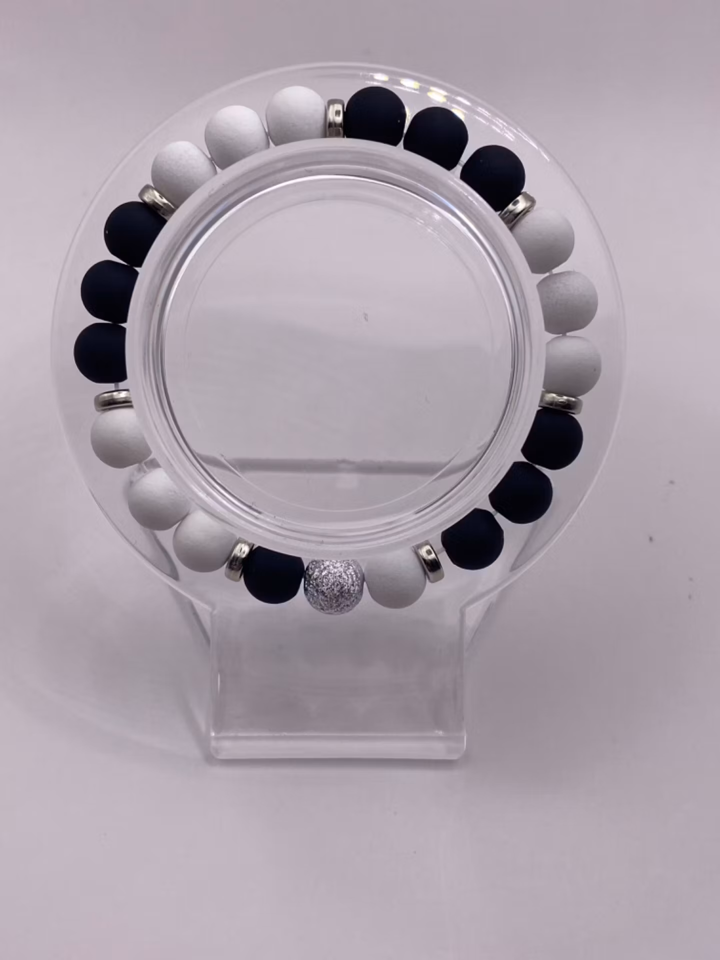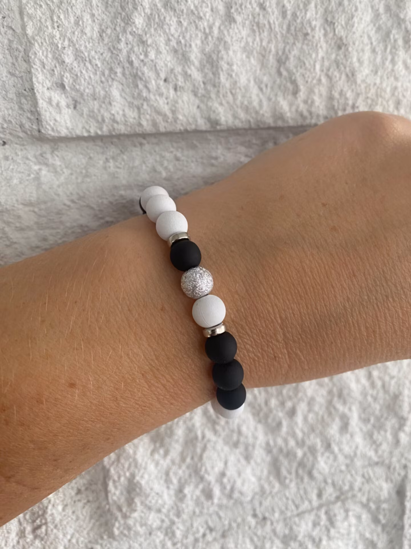 Tufft och stilrent armband i varvat mönster av matta vita och svarta stora pärlor och silverfärgade distanser. En silverfärgad ”borstad” pärla i blickfånget.Pär