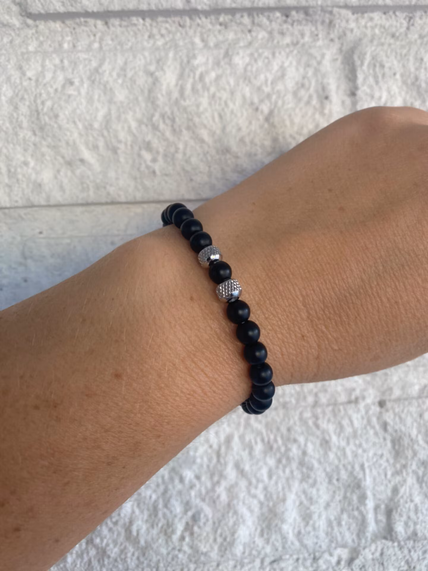 Tufft och stilrent armband i svarta mindre pärlor varvat med två mönstrade distanspärlor av rostfritt stål i blickfångetPärlor 6mmVisas produkten "Tillfälligt s