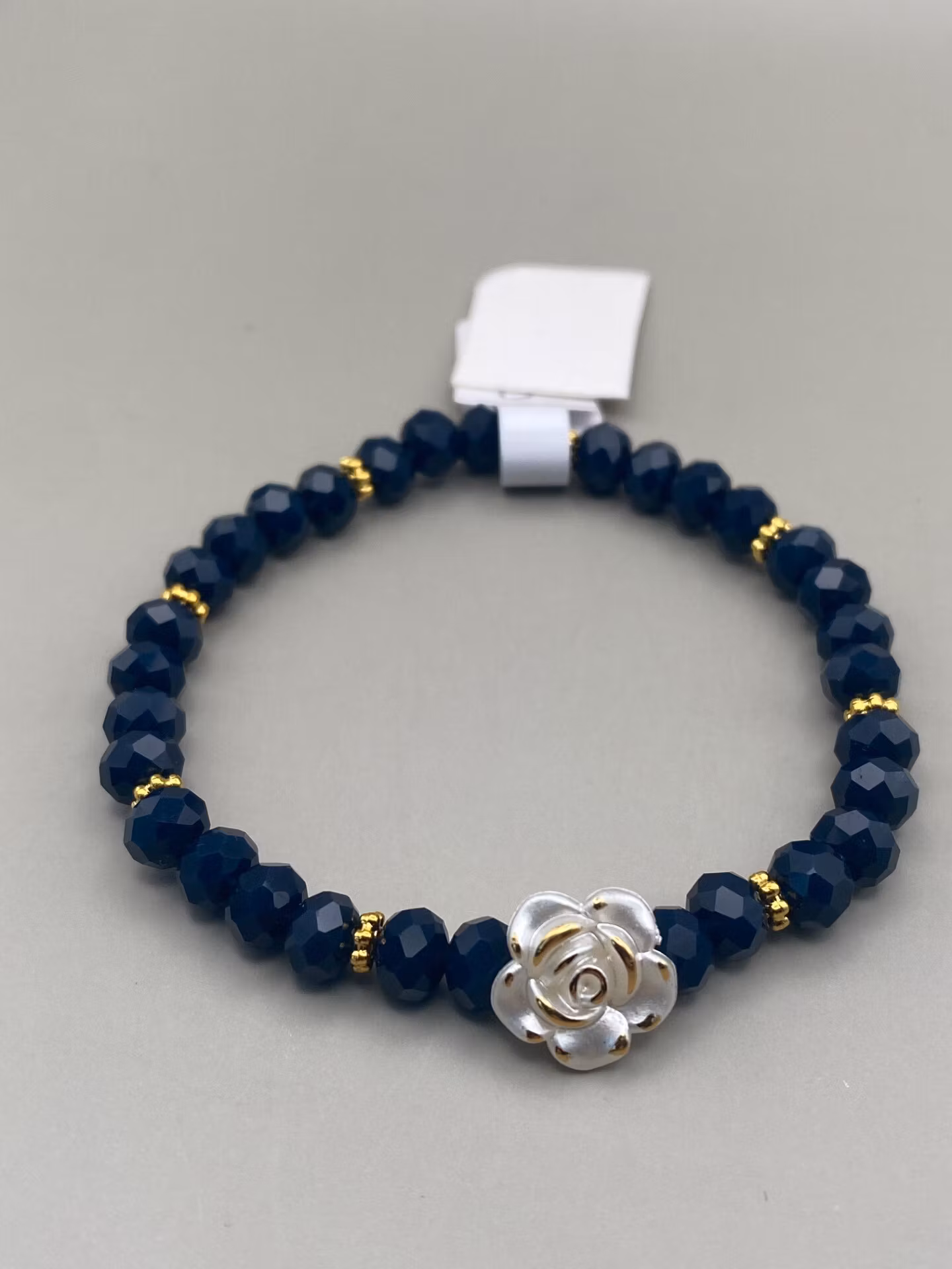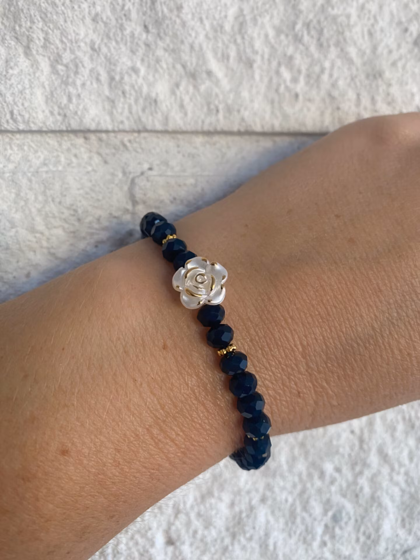 Snyggt armband i mörkt gråsvarta mindre glaspärlor, varvat med guldfärgade distanser, vacker liten benvit ros med guldfärgade kanter i blickfånget.Pärlor 6mmVis