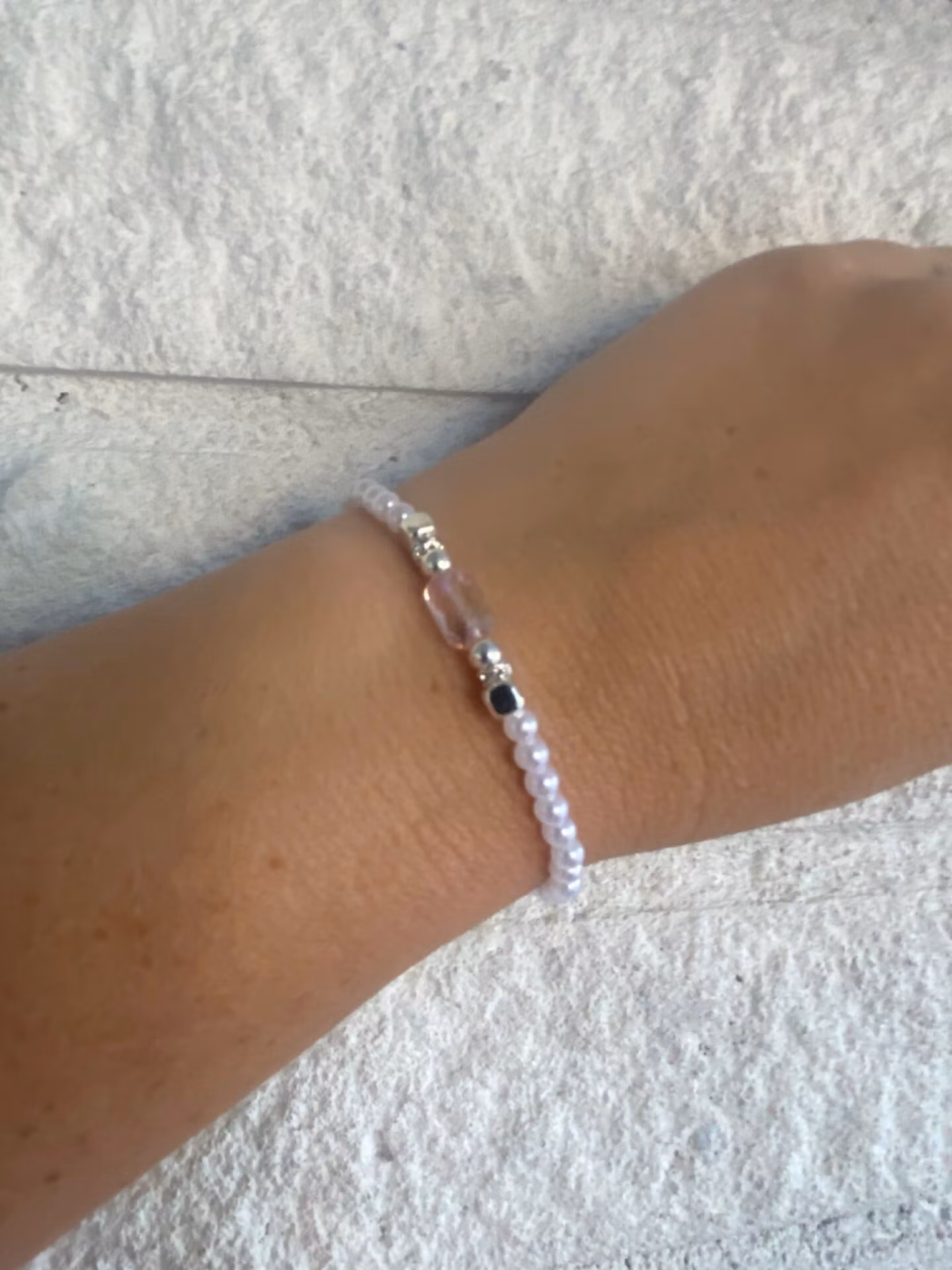 Sött armband i vita små pärlor, silverfärgade små pärlor, strass och ljusrosa glas sten i blickfånget.