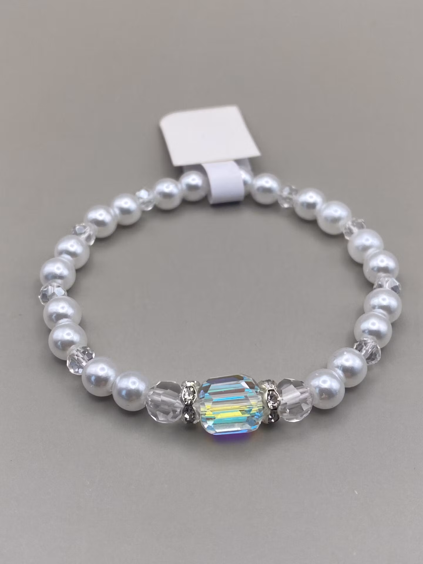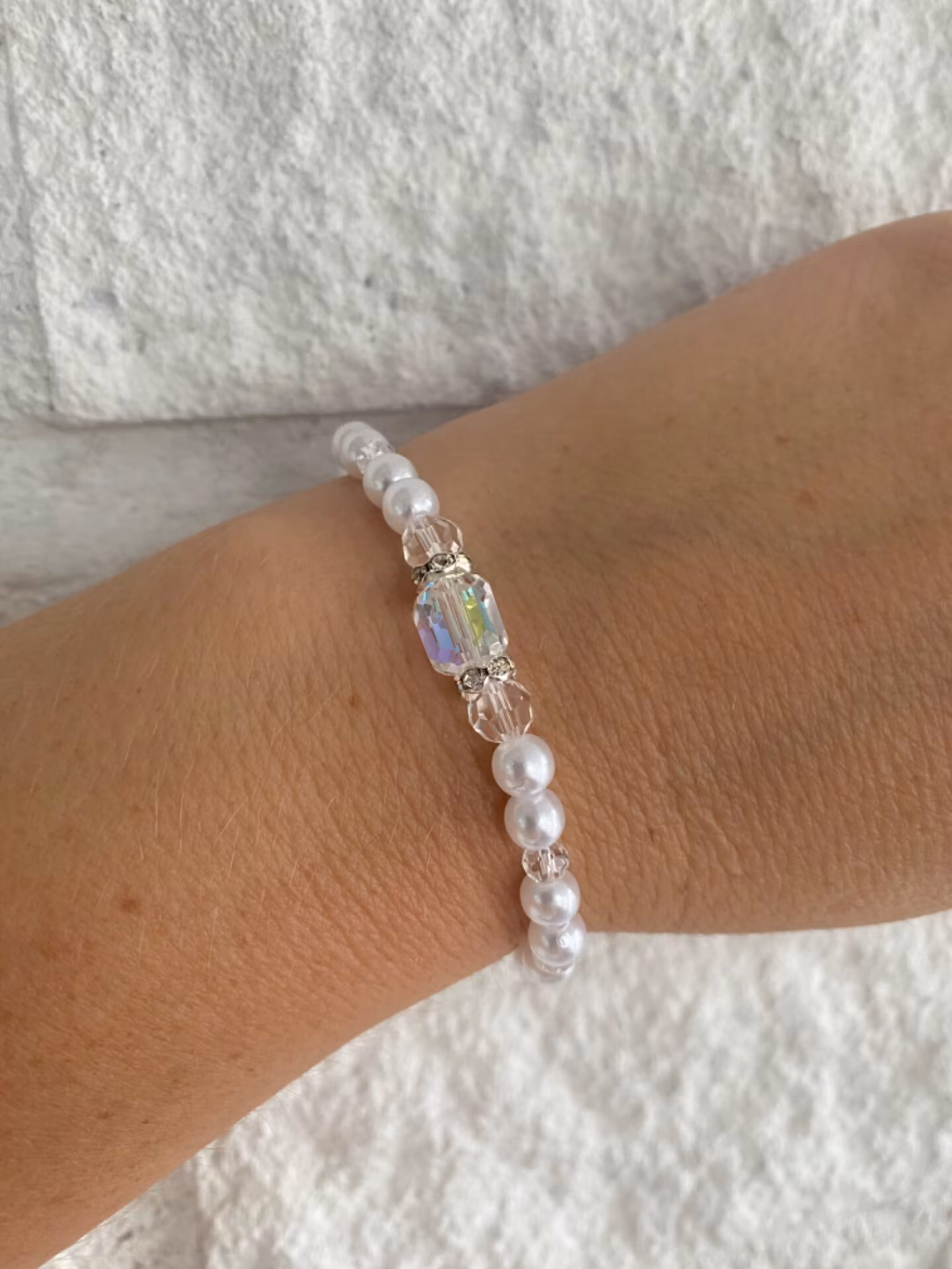 Fint armband i vita mindre pärlor varvat med genomskinliga små glaspärlor, strass och större cylindeformad glassten i blickfånget.