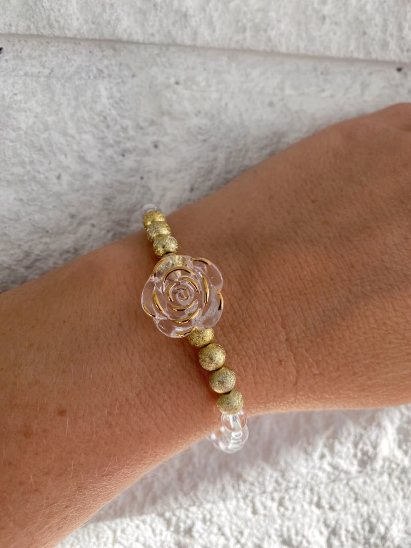 Fint armband i guldfärgade borstade pärlor, i blickfånget en genomskinlig ros med guldfärgade kanter. Runt om genomskinliga pärlor.