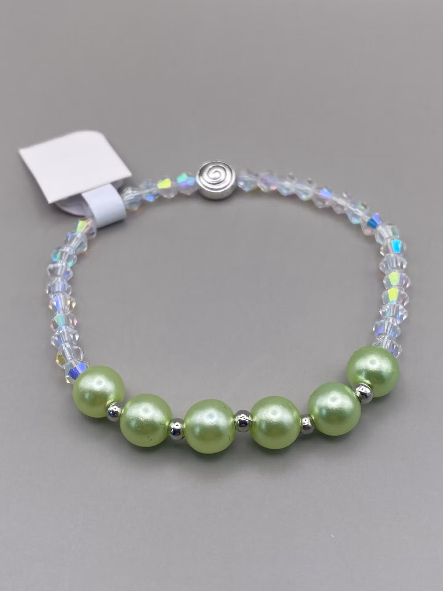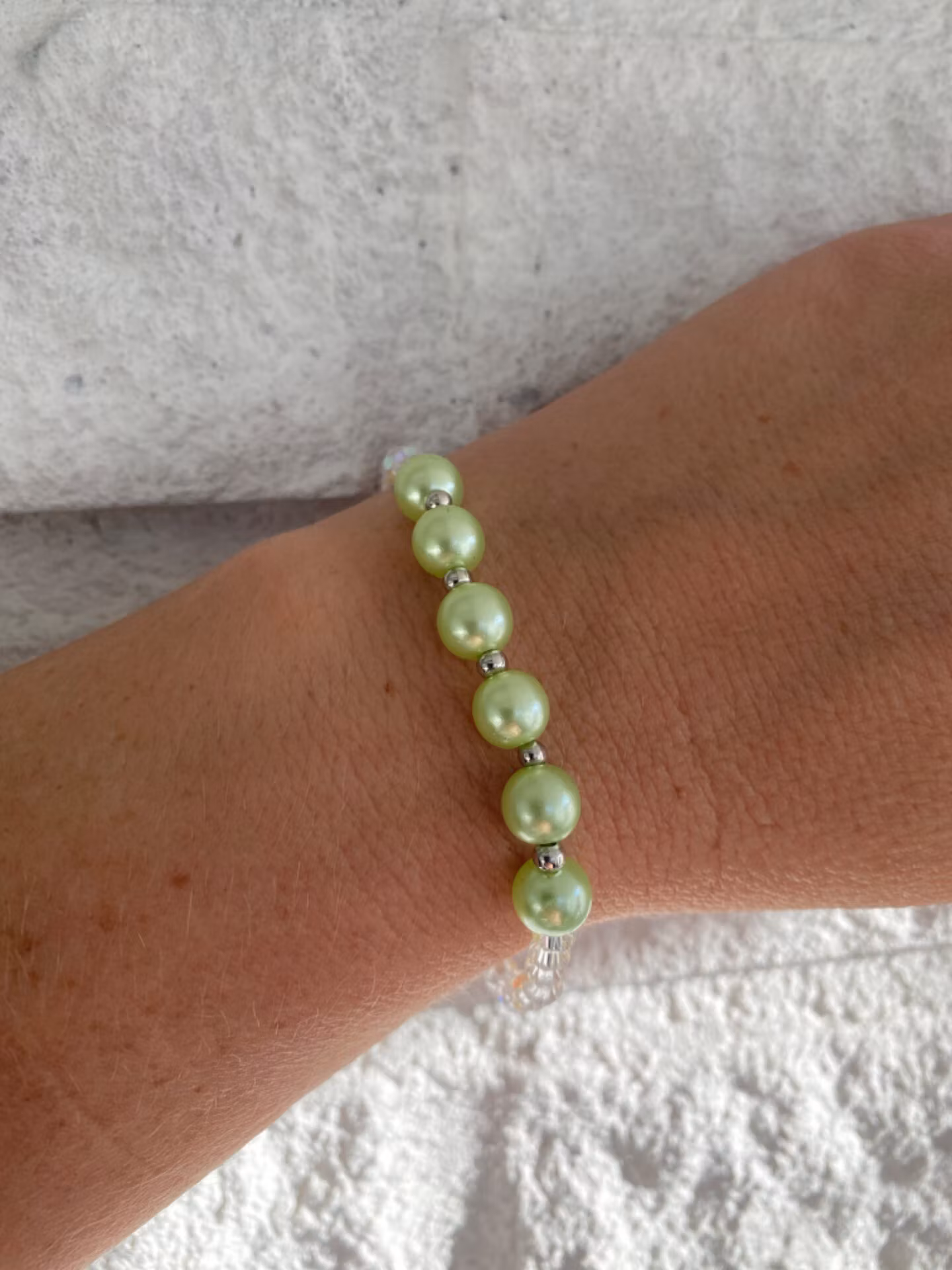 Armband i ljusgröna glansiga pärlor varvat med små silverfärgade pärlor i blickfånget. Små genomskinliga glaspärlor runt om och fin avslutspärlaPärlor 8mm, 4mmV