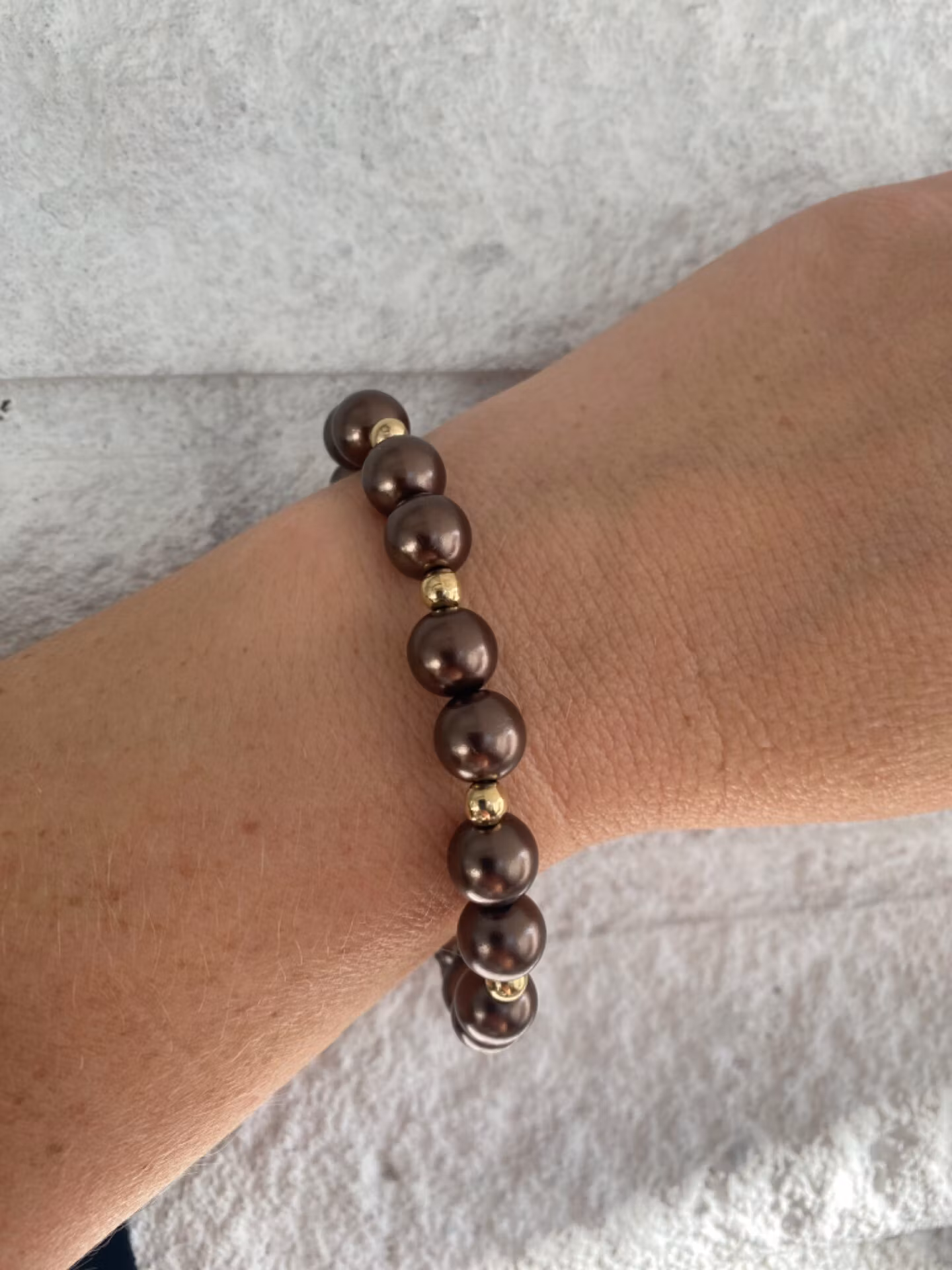 Stiligt armband i stora kaffebruna pärlor varvat med guldfärgade mindre pärlor