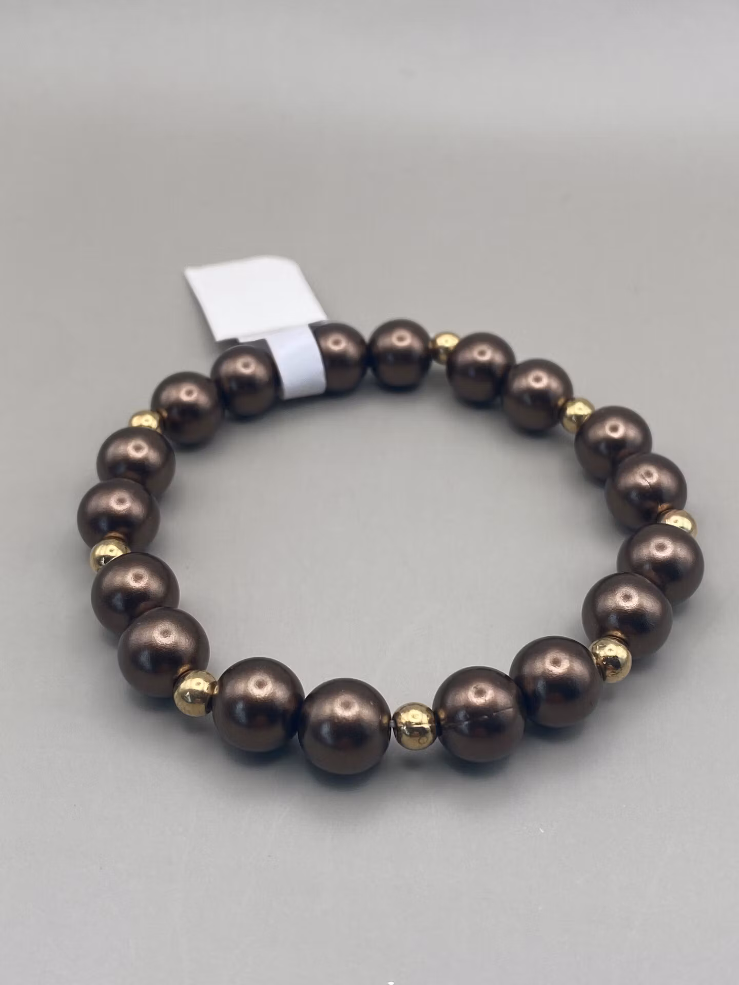 Stiligt armband i stora kaffebruna pärlor varvat med guldfärgade mindre pärlorPärlor 10mm.Visas produkten "Tillfälligt slut" efter att du lagt den i din kundkor