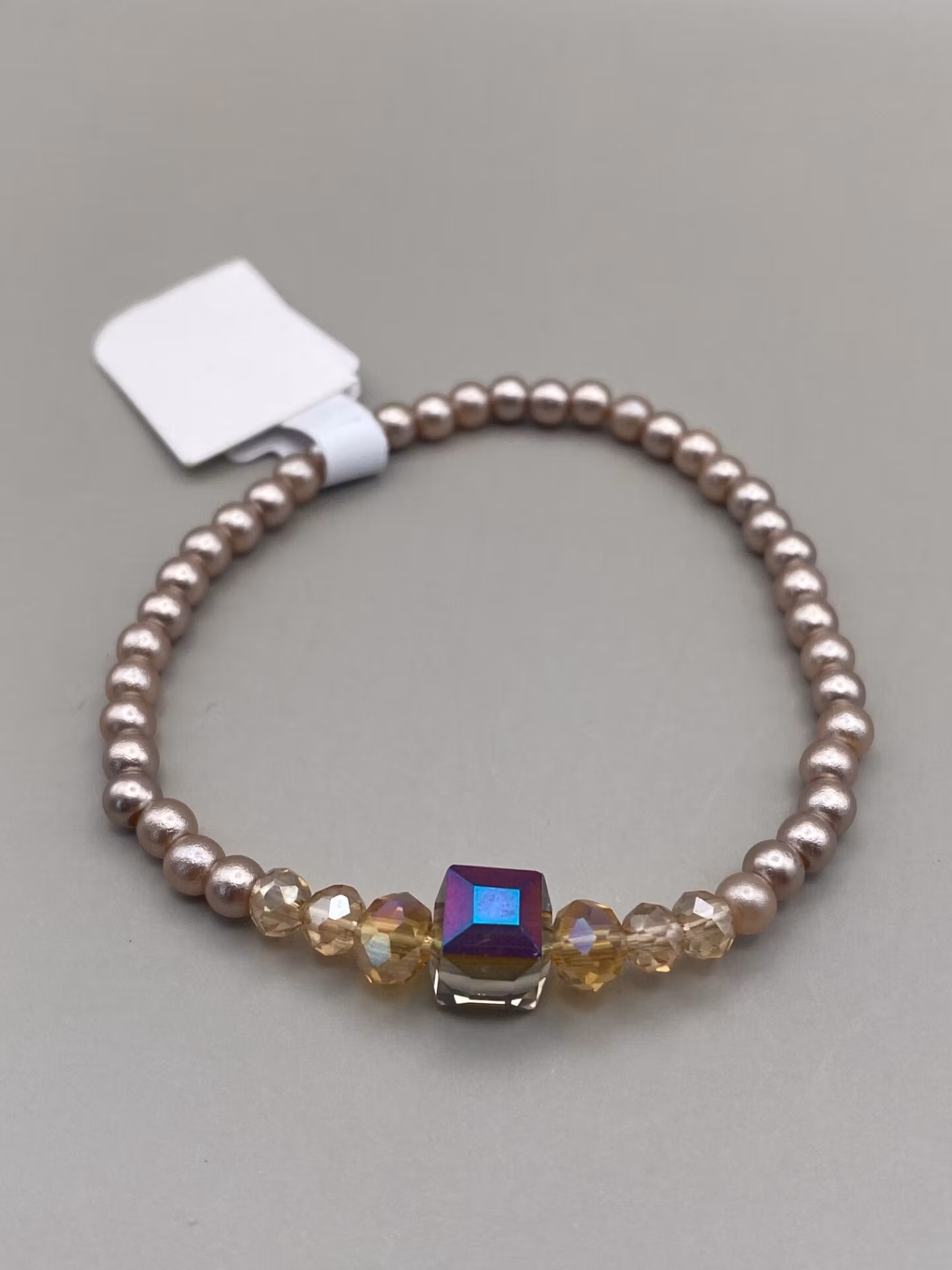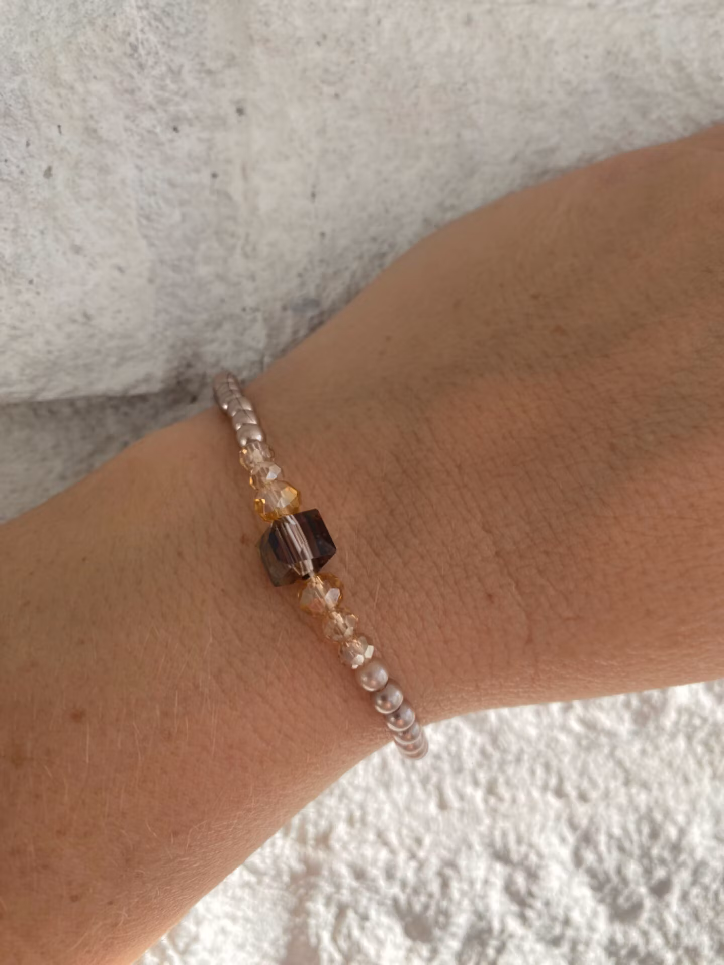 Fint armband i champagnefärgade små pärlor runt om, champagnefärgade glaspärlor och fyrkantig. champagnefärgad glaspärla i blickfånget.