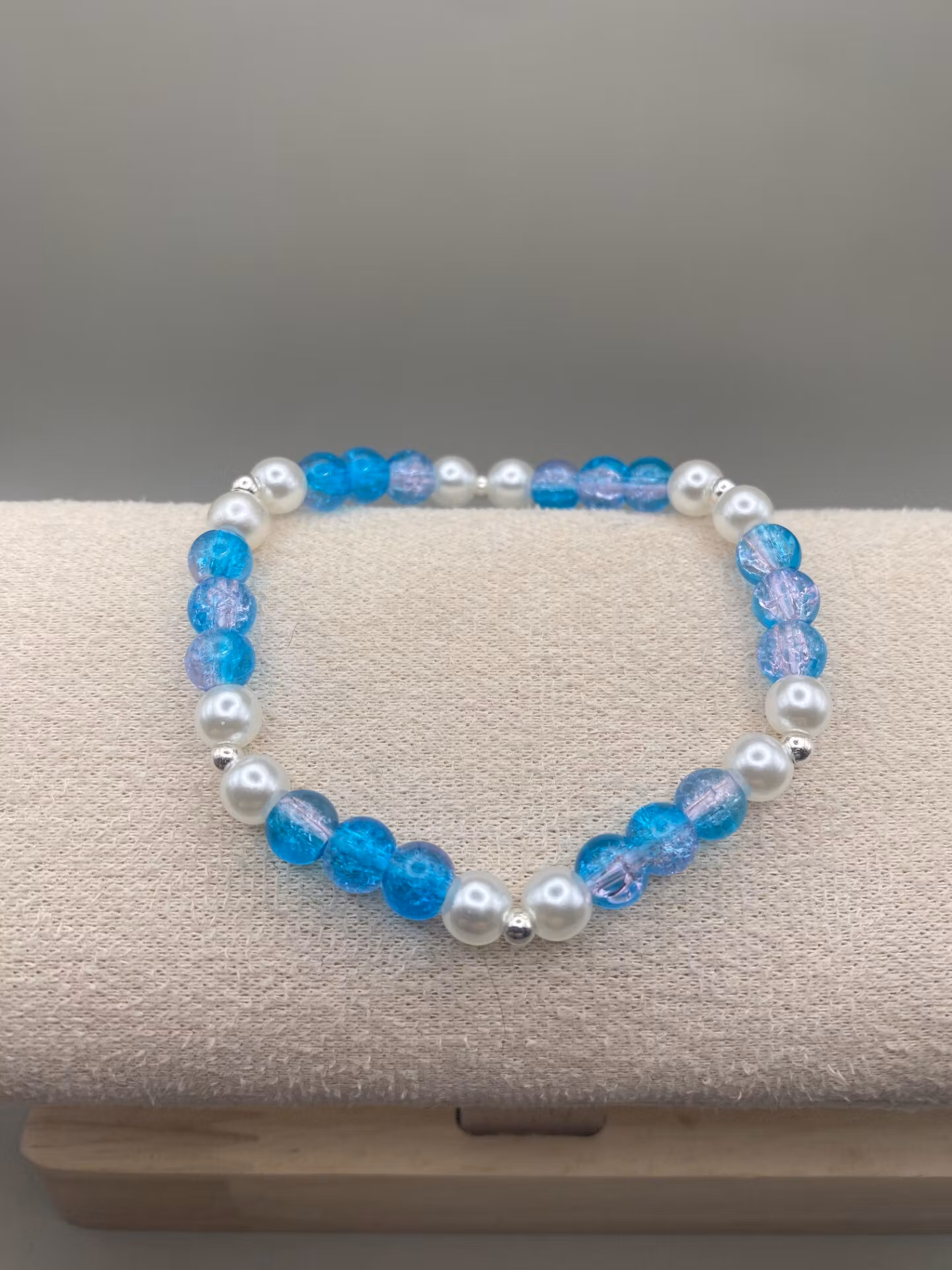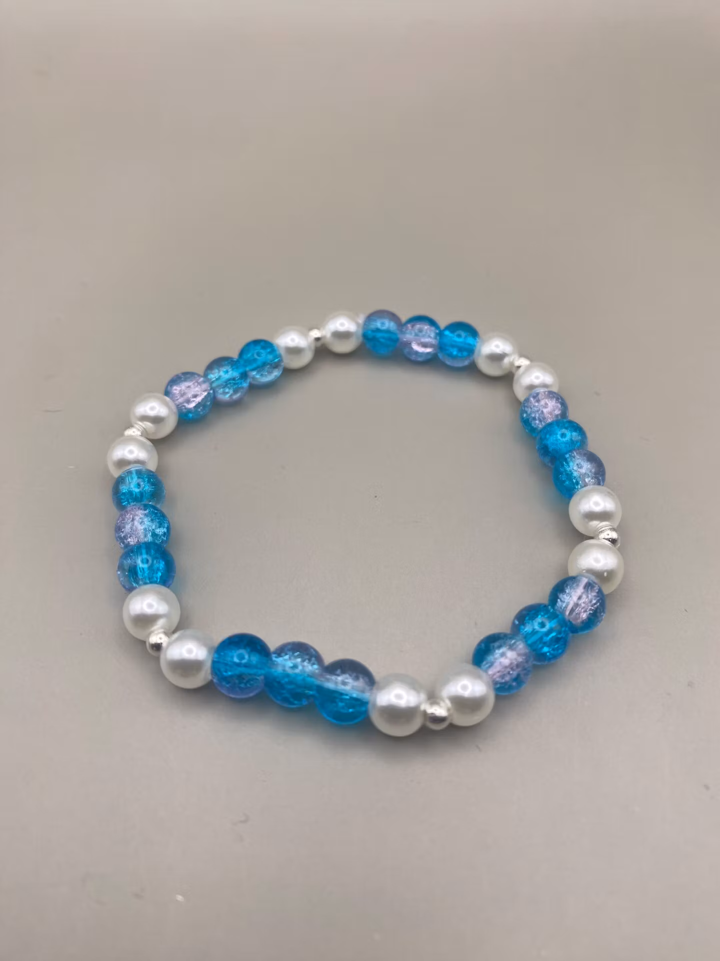 Somrigt armband i turkosblå mellerade runda glaspärlor varvat med högblanka benvita pärlor och smp silverfärgade pärlor.