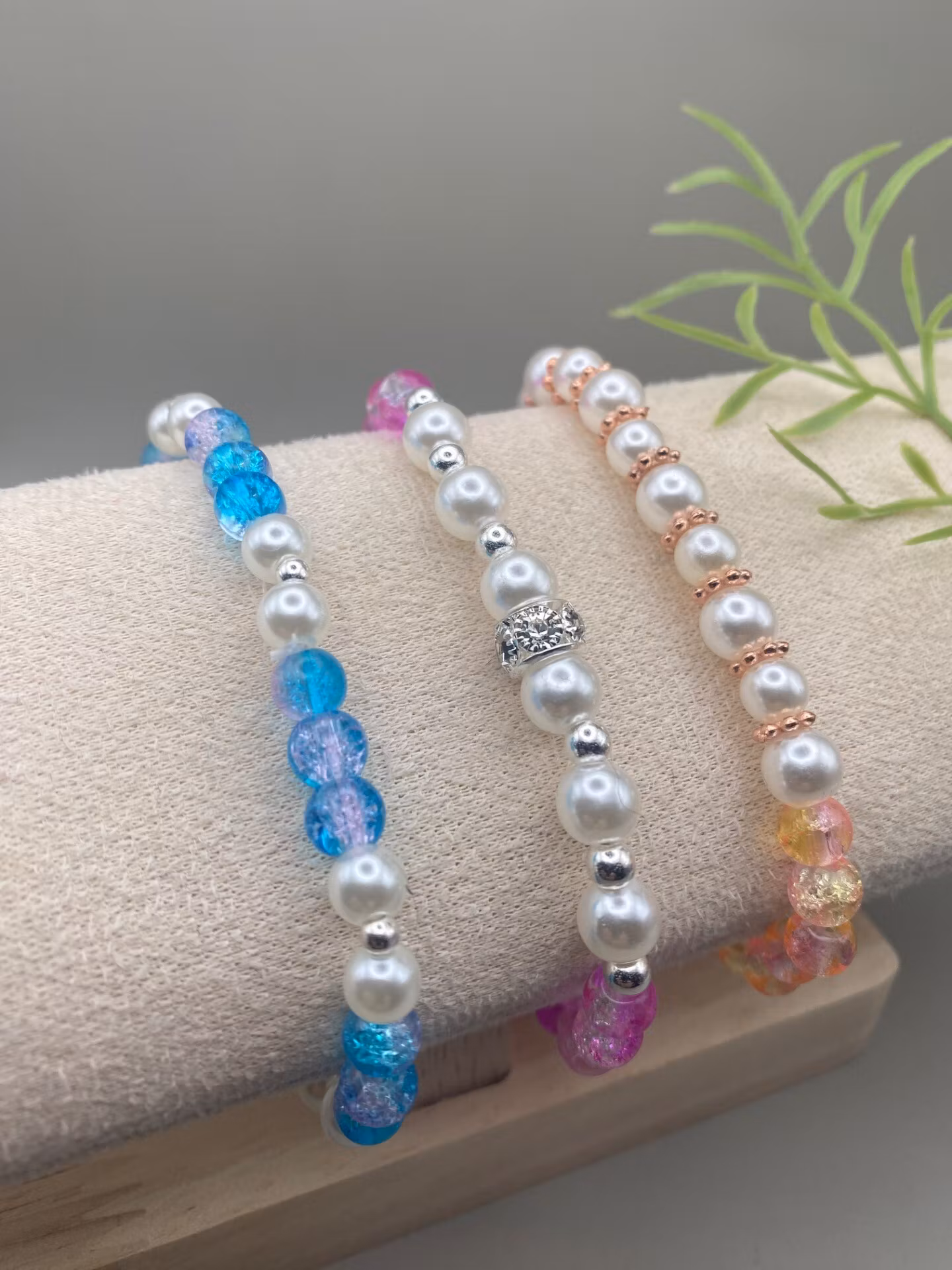 Somrigt armband i turkosblå mellerade runda glaspärlor varvat med högblanka benvita pärlor och smp silverfärgade pärlor.Pärlor: 6mm, 3mmVisas produkten "Tillfäl