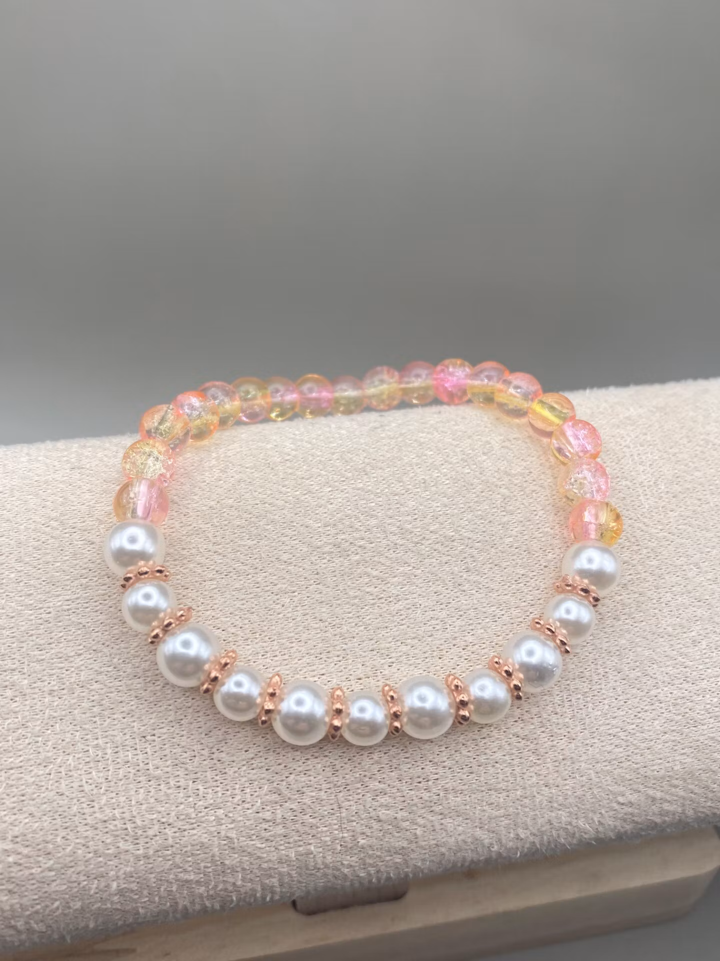 Somrigt armband i aprikosa mellerade runda glaspärlor runt om, varvat två olika storlekar av benvita högblanka pärlor och roséfärgade distanser i blickfånget.