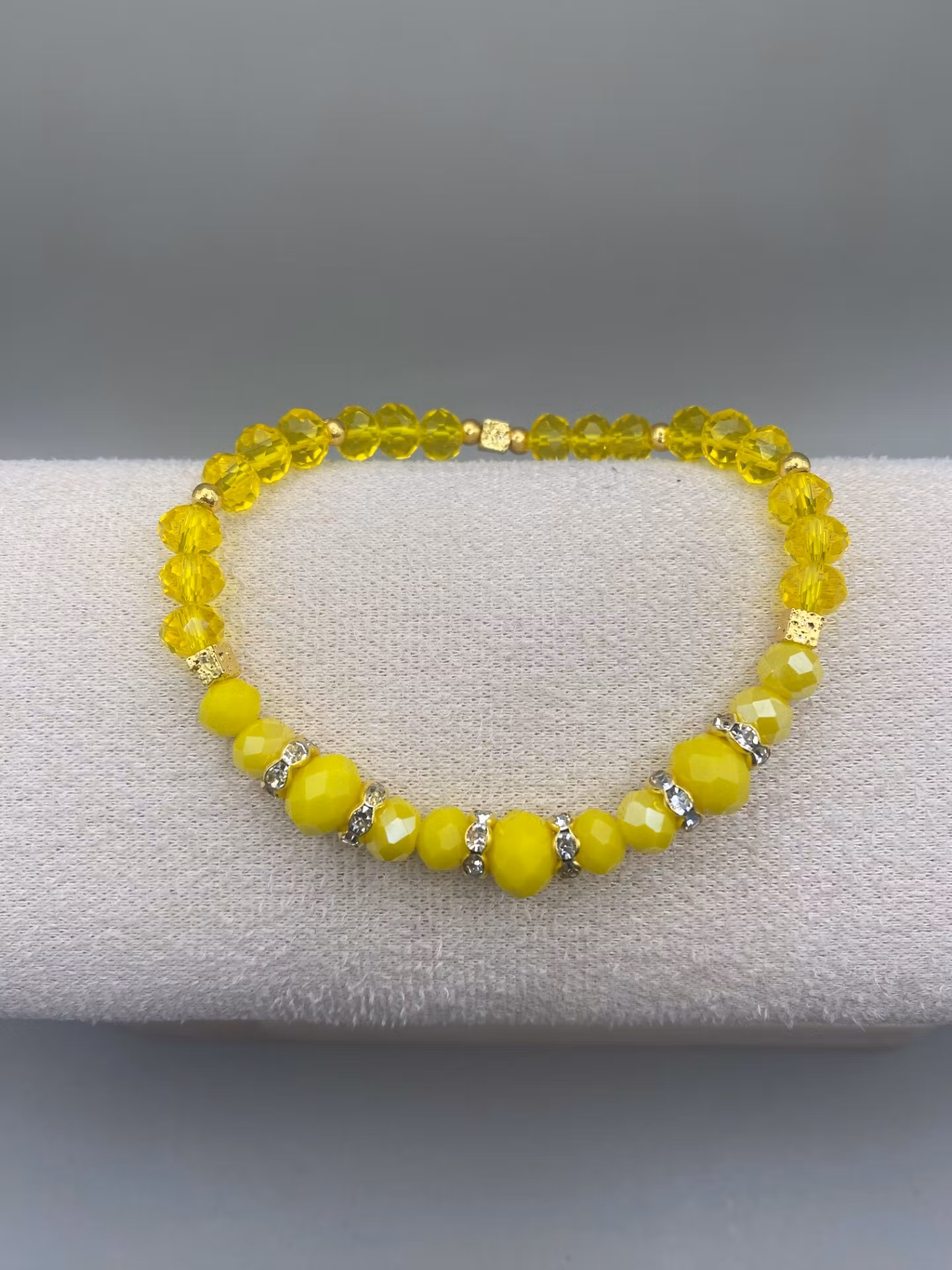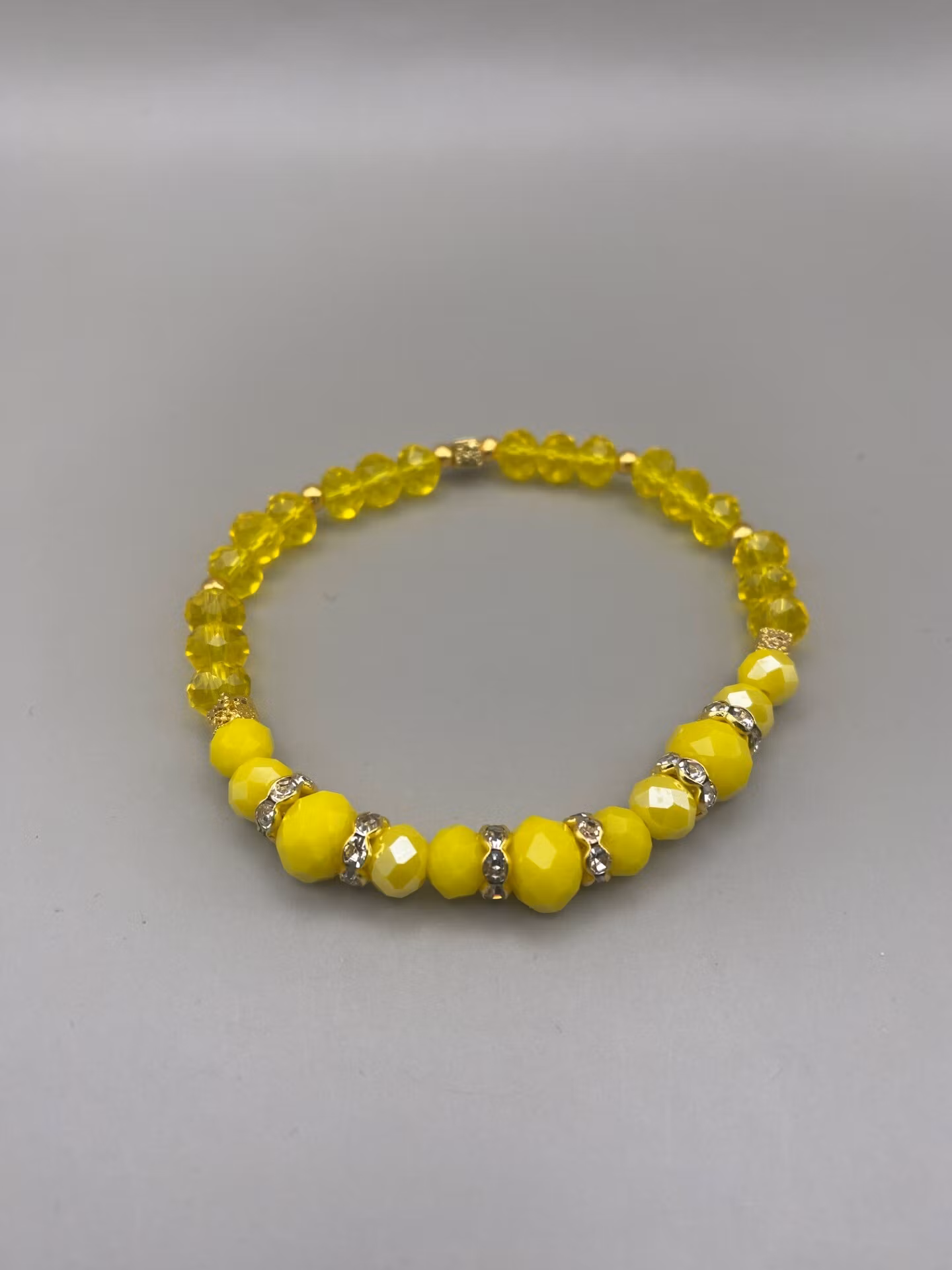 Härligt lekfullt armband i gula facetterade porslinspärlor i två storlekar varvat med guldfärgad strass i blickfånget. Gula facetterade glaskristallpärlor runt