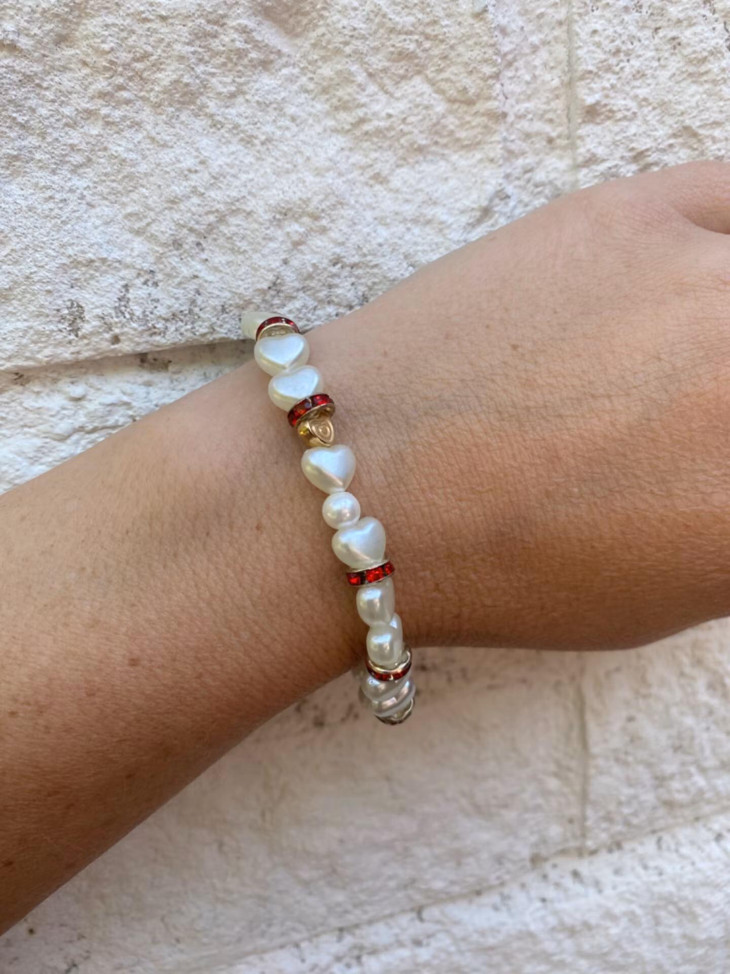 Vita hjärtan varvat med runda vita pärlor, guldfärgade hjärtan och röda strassdetaljer