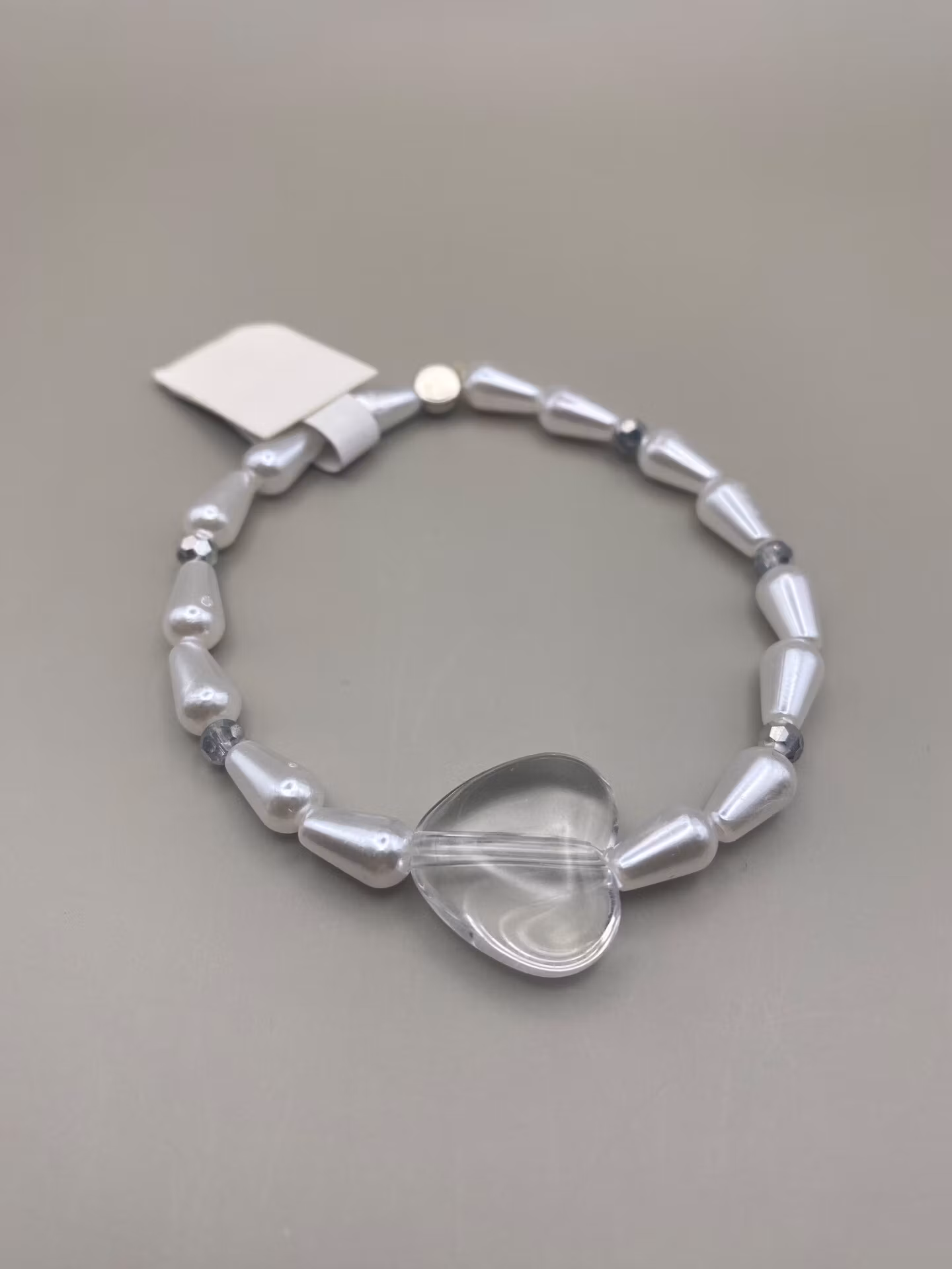 Armband i vita avlånga pärlor varvat grå glaspärlor, stort genomskinligt hjärta i blickfånget