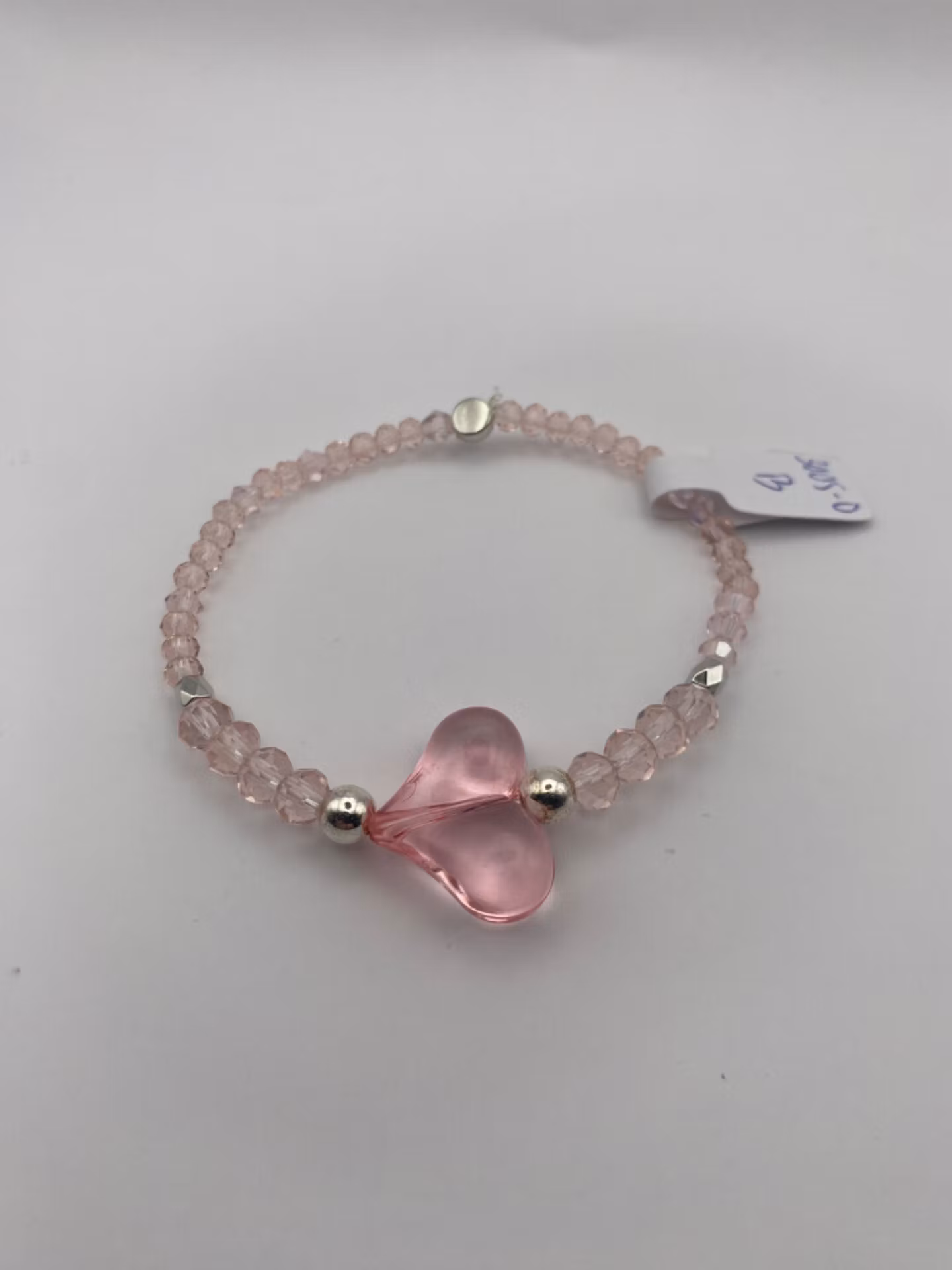 Armband i ljusrosa glaspärlor, silvriga detaljer och ljusrosa hjärta i blickfånget