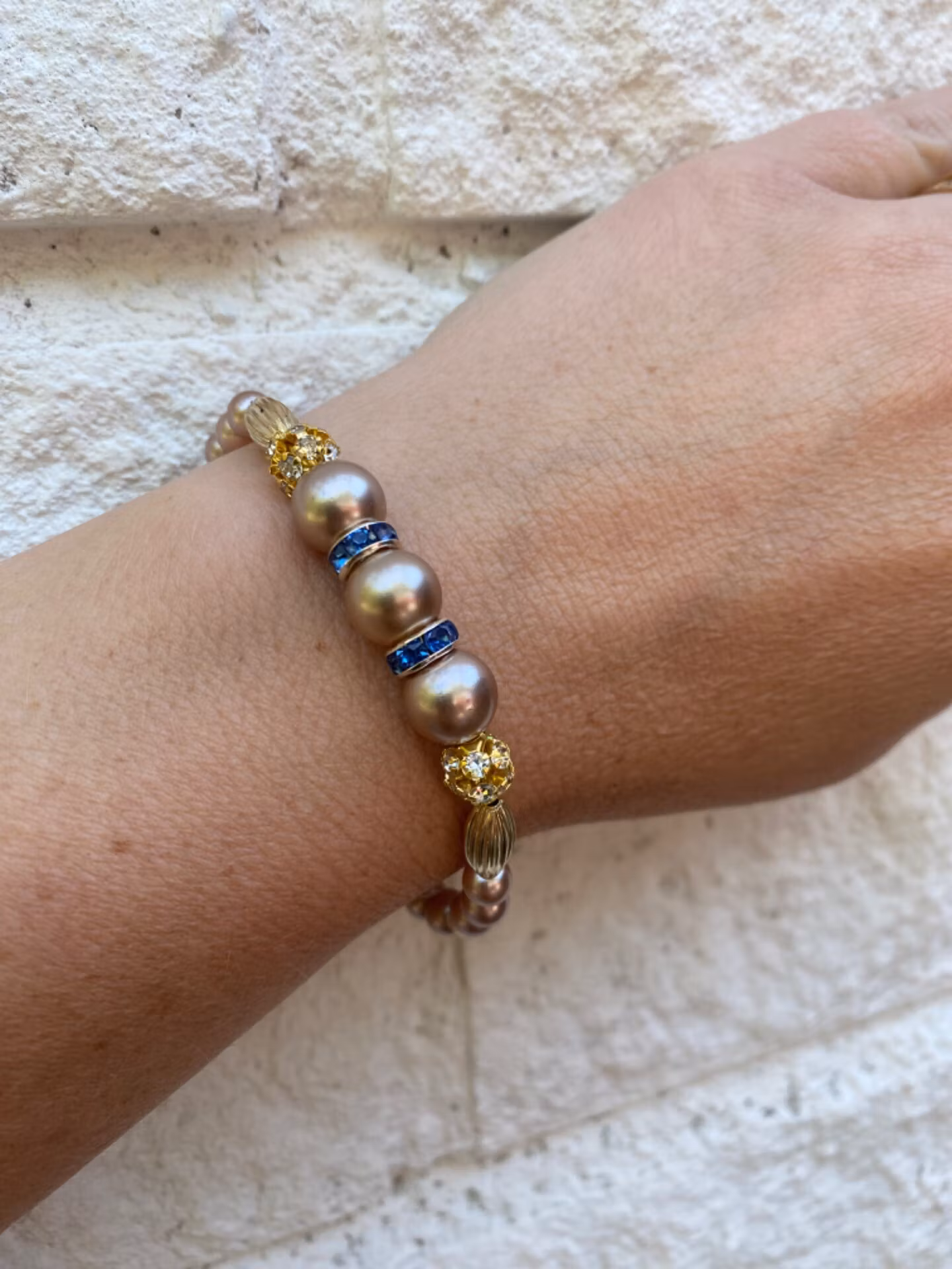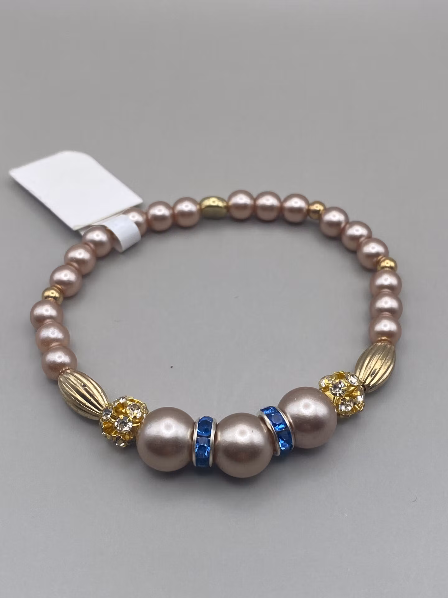 Armband i champagnefärgade pärlor, guldfärgade pärlor och detaljer, blå strass