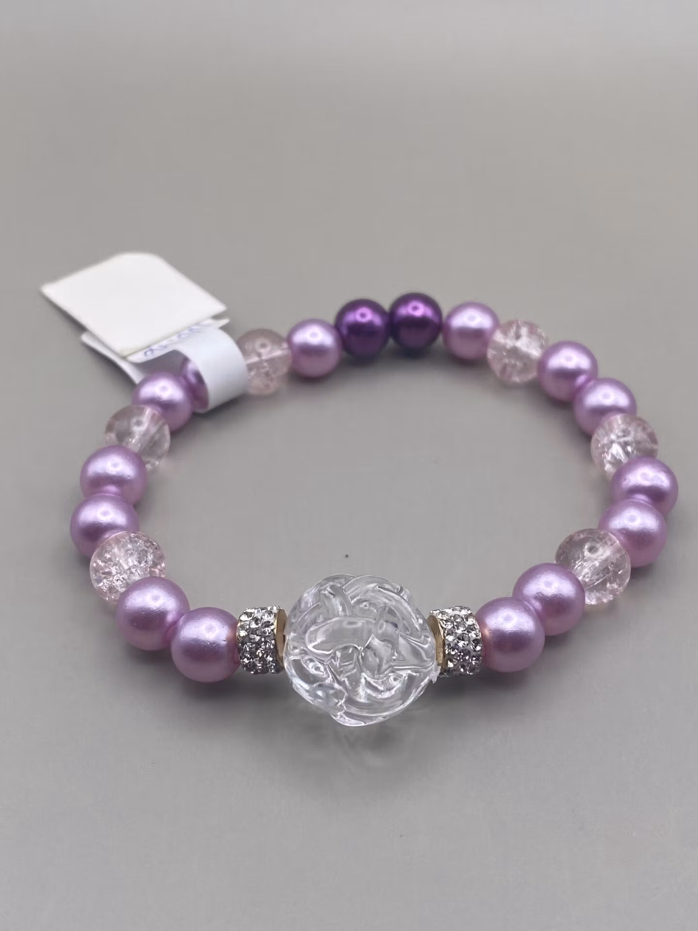 Armband i ljuslila pärlor, varvat med glaspärlor, stor rund genomskinlig ros med strassdetaljer i blickfånget