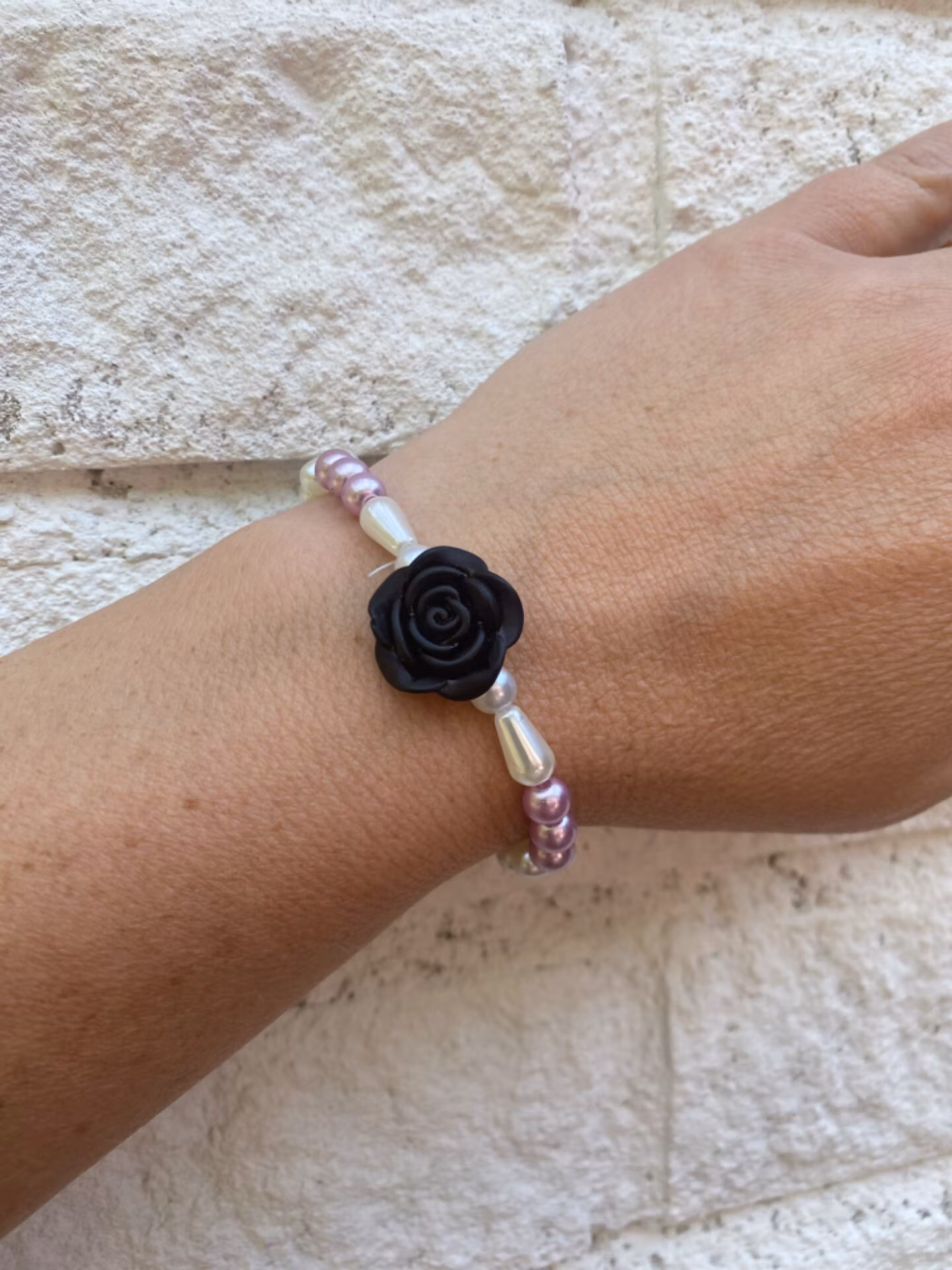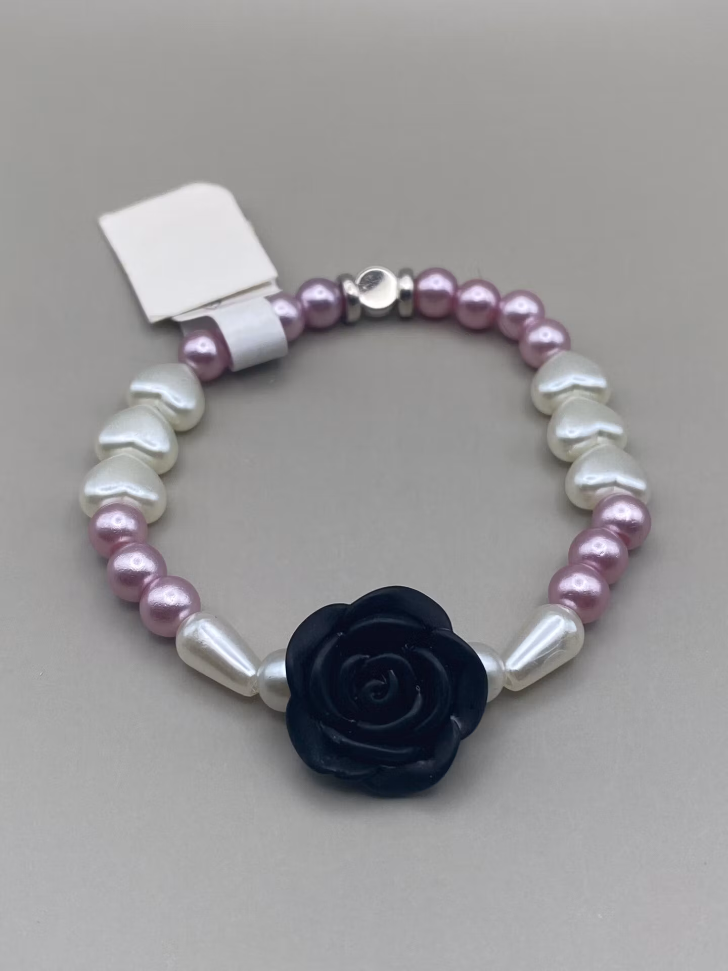 Armband med beiga pärlor, hjärtformade och konformade, varvat med ljuslila pärlor. Svart ros i blickfånget.